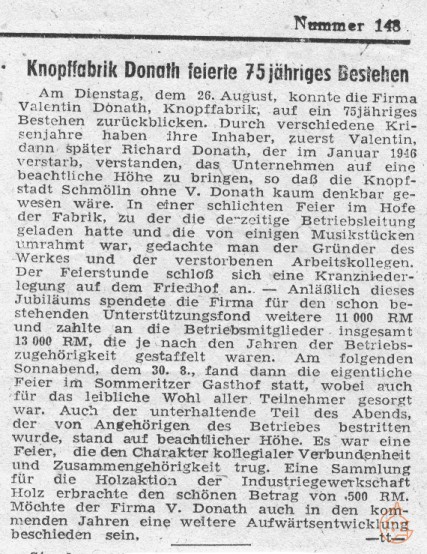 Artikel zum 75jährigen Bestehen der Knopffabrik Valentin Donath