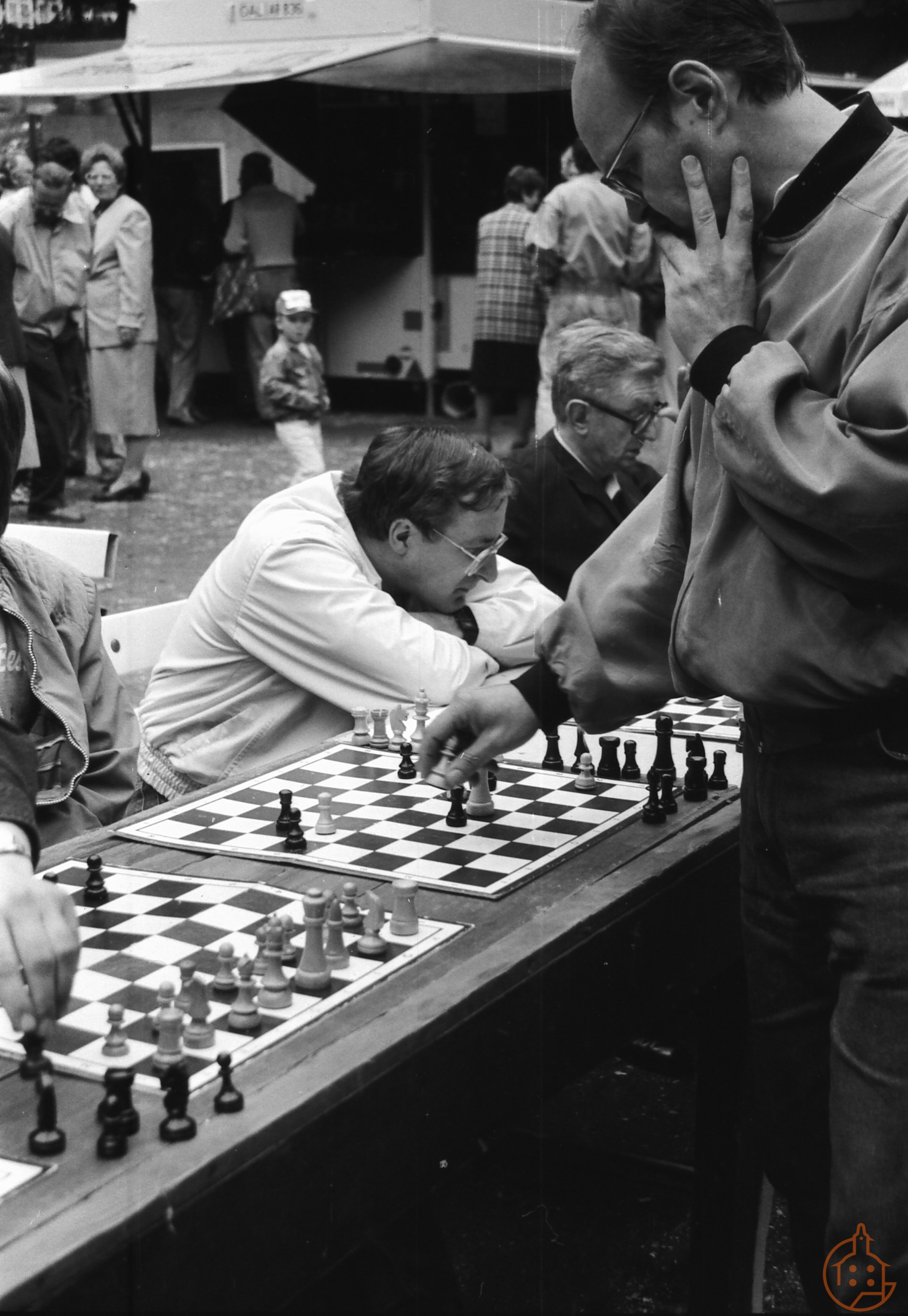 Besucher beim Schachspiel vor der Walter-Kluge-Turnhalle auf dem Pfefferberg anläßlich der 925-Jahr-Feier