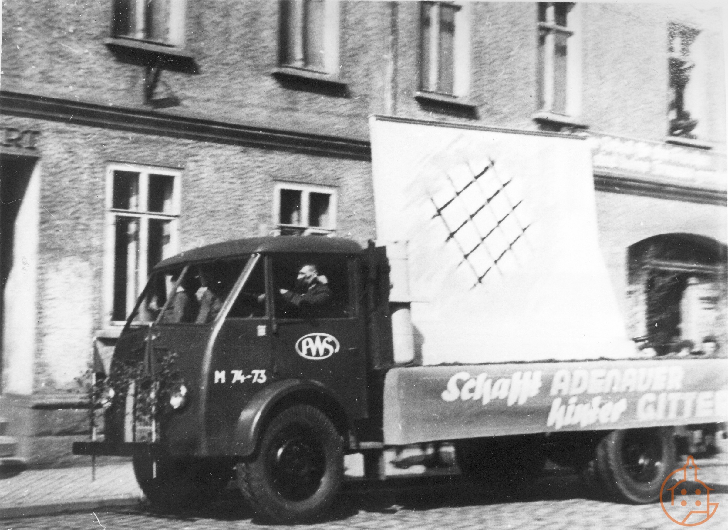 Auto mit Plakat zum 1. Mai auf dem Amtsplatz (vor Optiker Siebert)