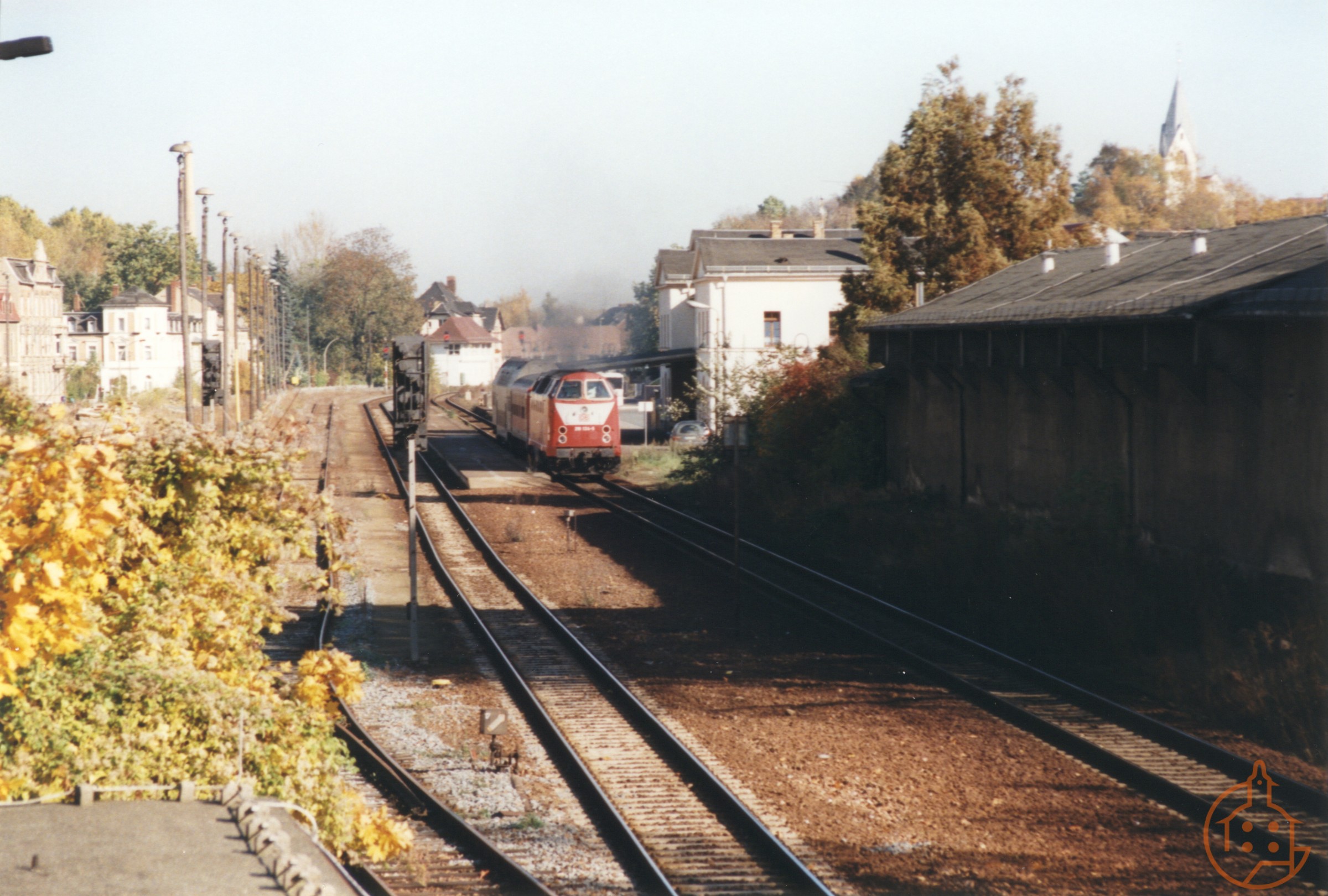 Blick vom Stellwerk auf das Bahngelände mit ausfahrendem Zug in Richtung Gera