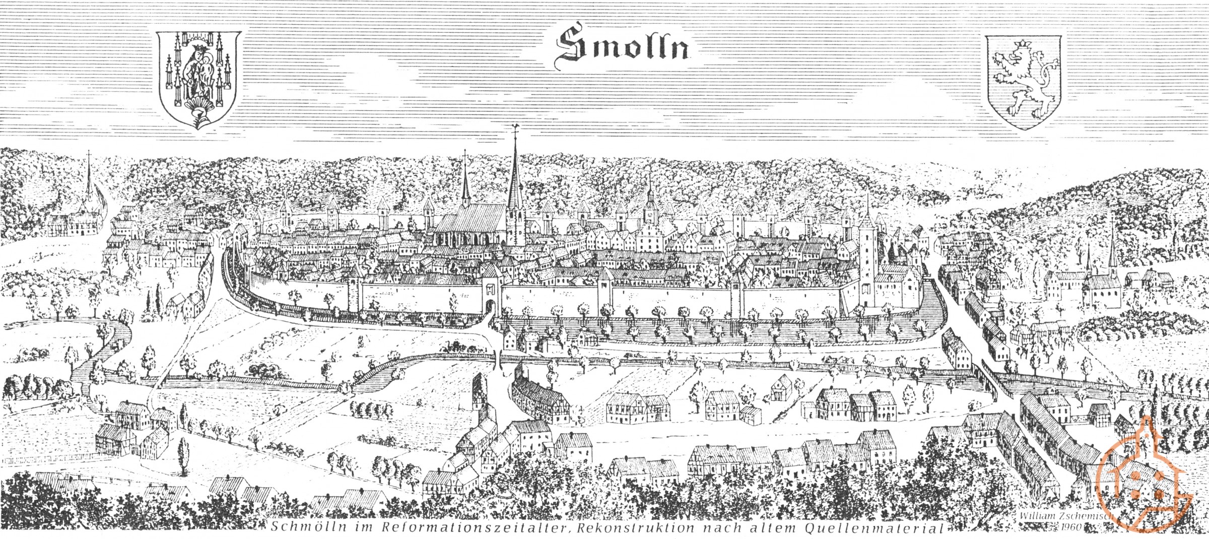 Alte Stadtansicht von "Smolln" vom 16. Jahrhundert, Rekonstruktion 1960 nach altem Quellenmaterial.