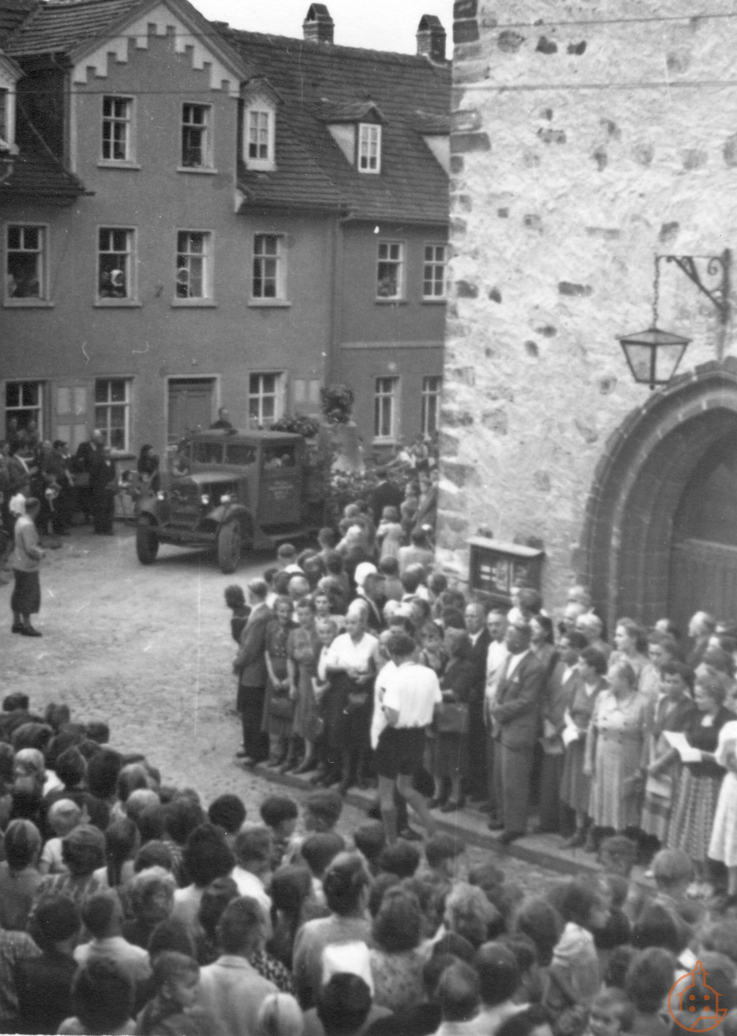 Ankunft der neuen Glocken auf einem LKW des Fuhrgeschäftes Willy Lorenz an der Stadtkirche St. Nicolai