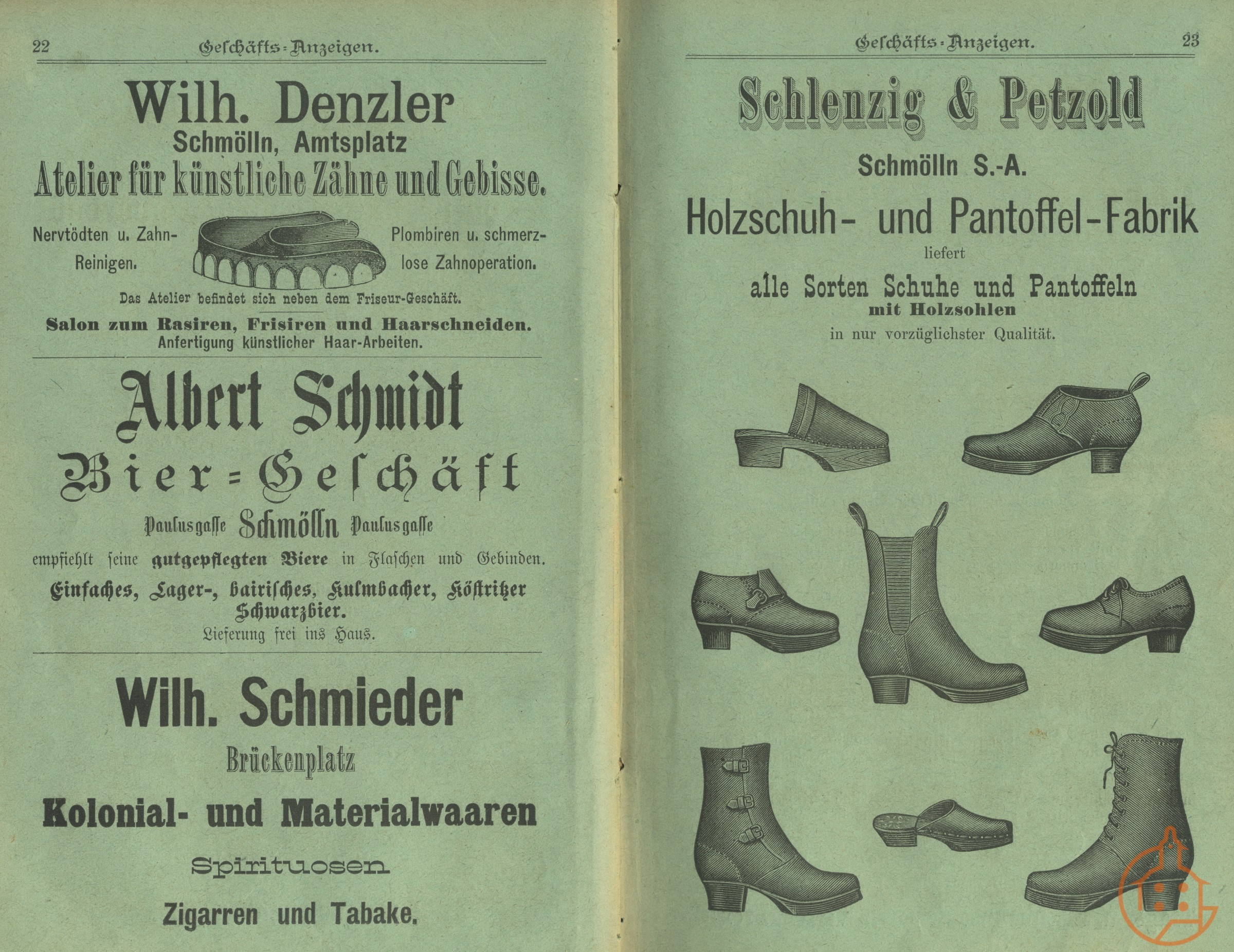 Adressbuch 1890/91, Dentist Denzler, Biergeschäft Schmidt, Kolonialwaren Schmieder, Schuhfabrik Schlenzig&Petzold