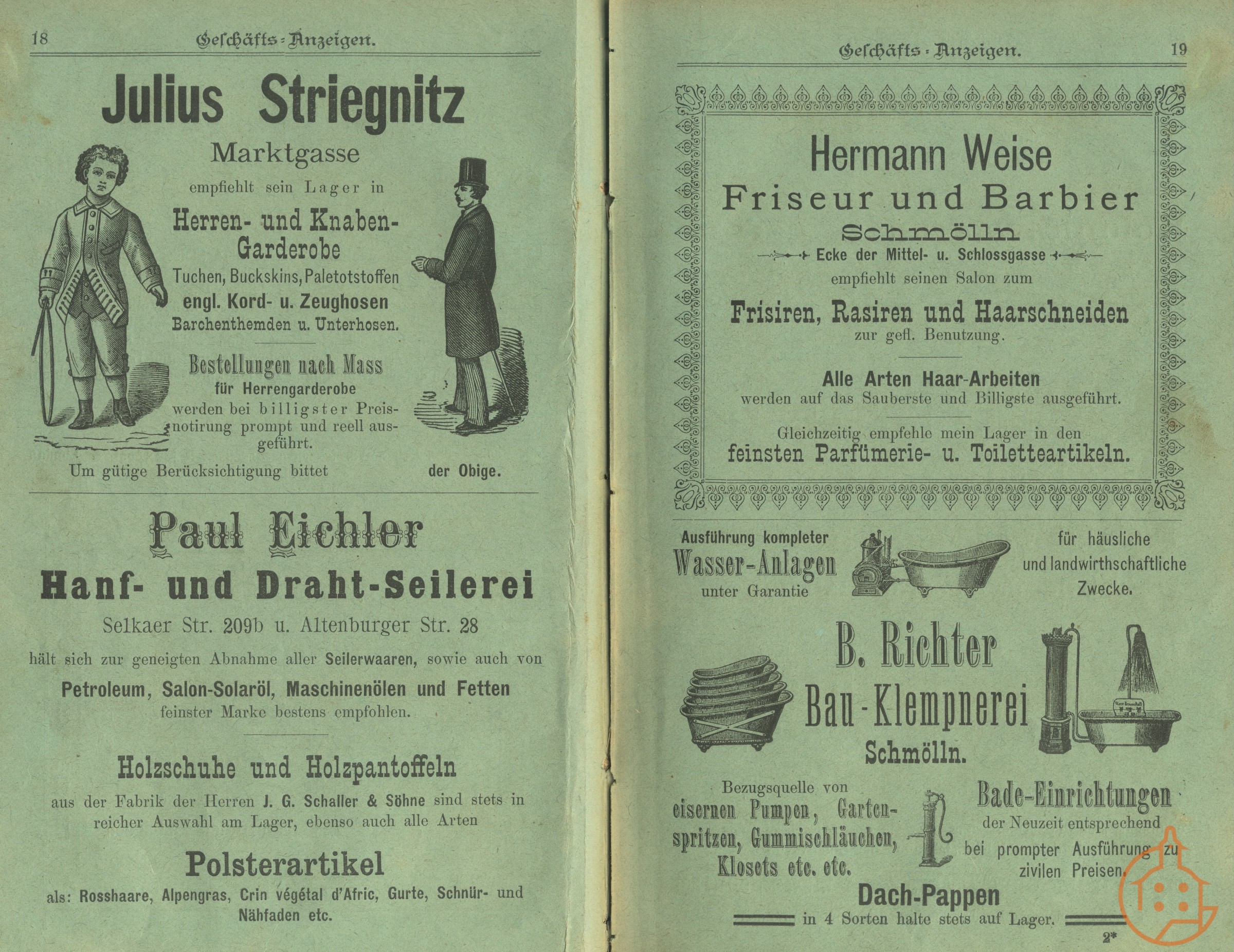 Adressbuch 1890/91, Modewaren Striegnitz, Seilerei Eichler, Friseur Weise, Klempnerei Richter