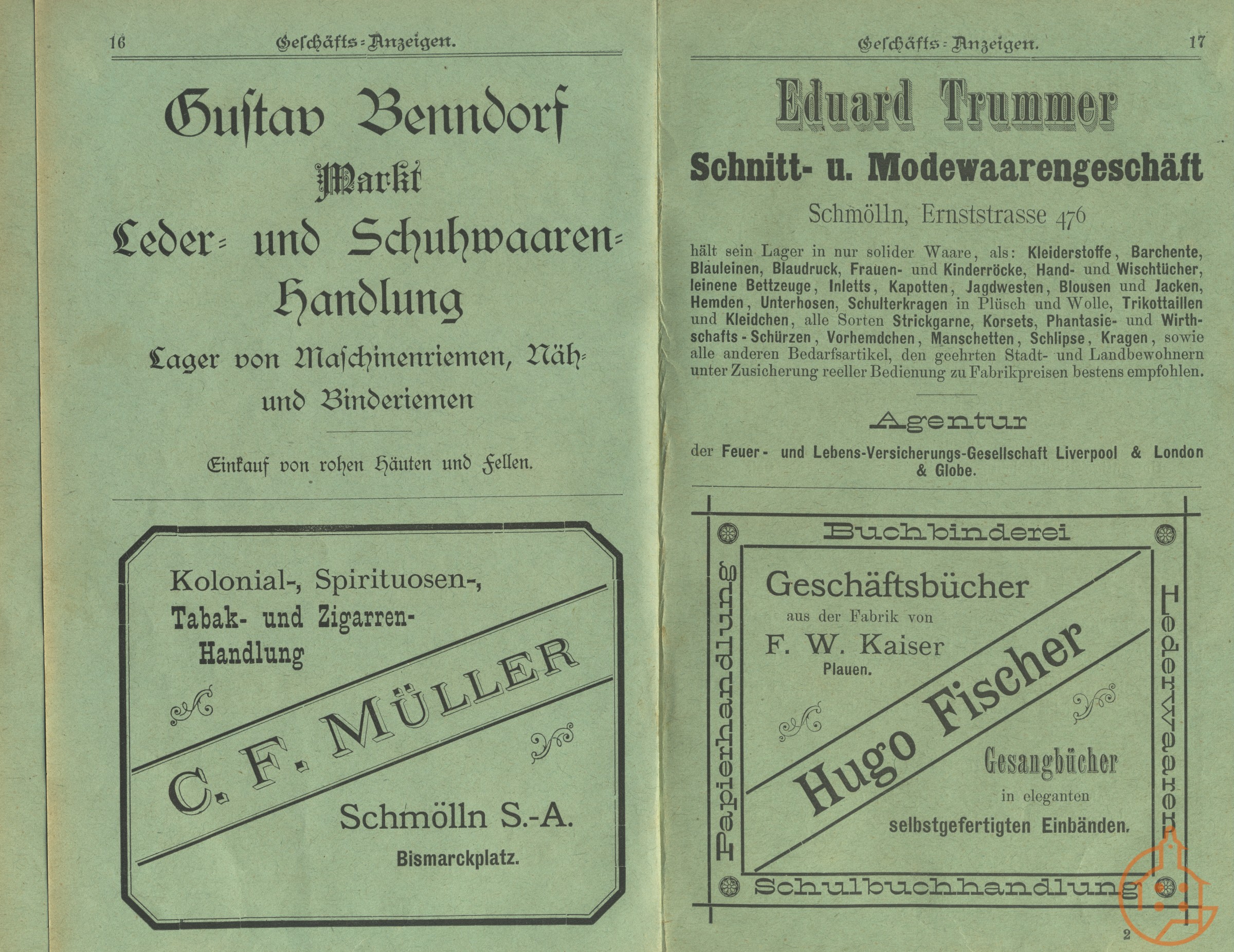 Adressbuch Schmölln, Lederhandlung Benndorf, Kolonialwaren Müller, Modewaren Trummer, Buchbinderei Fischer