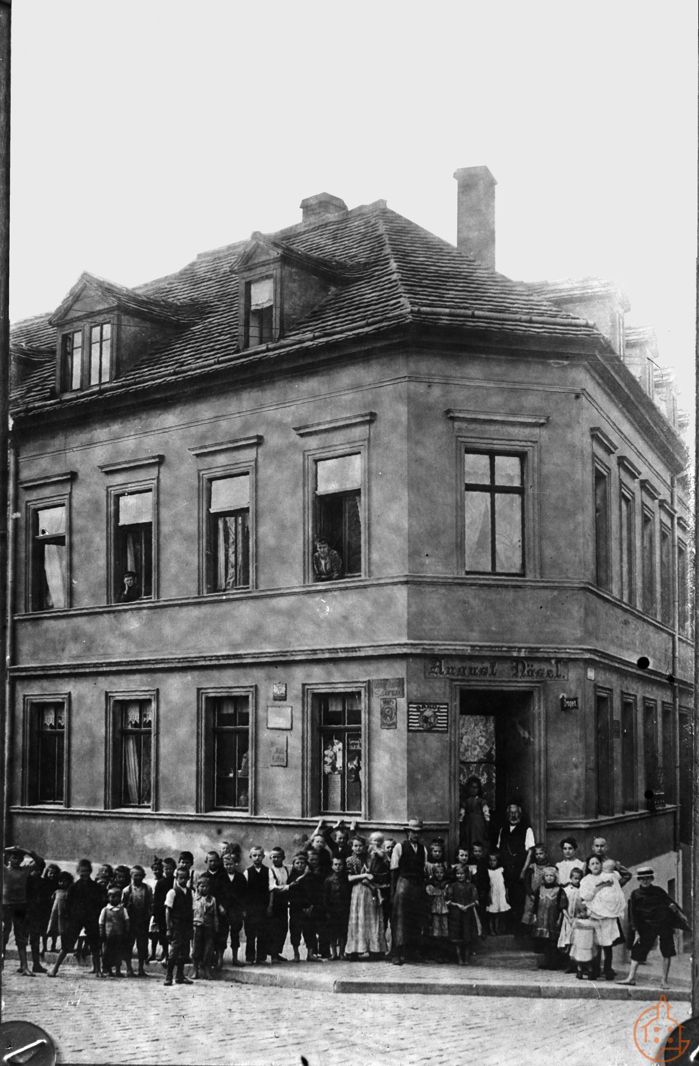 Eckhaus Altenburger Straße (Gößnitzer Straße)/Ernststraße 1 (Rosa-Luxemburg-Straße 1) mit Laden von August Nösel