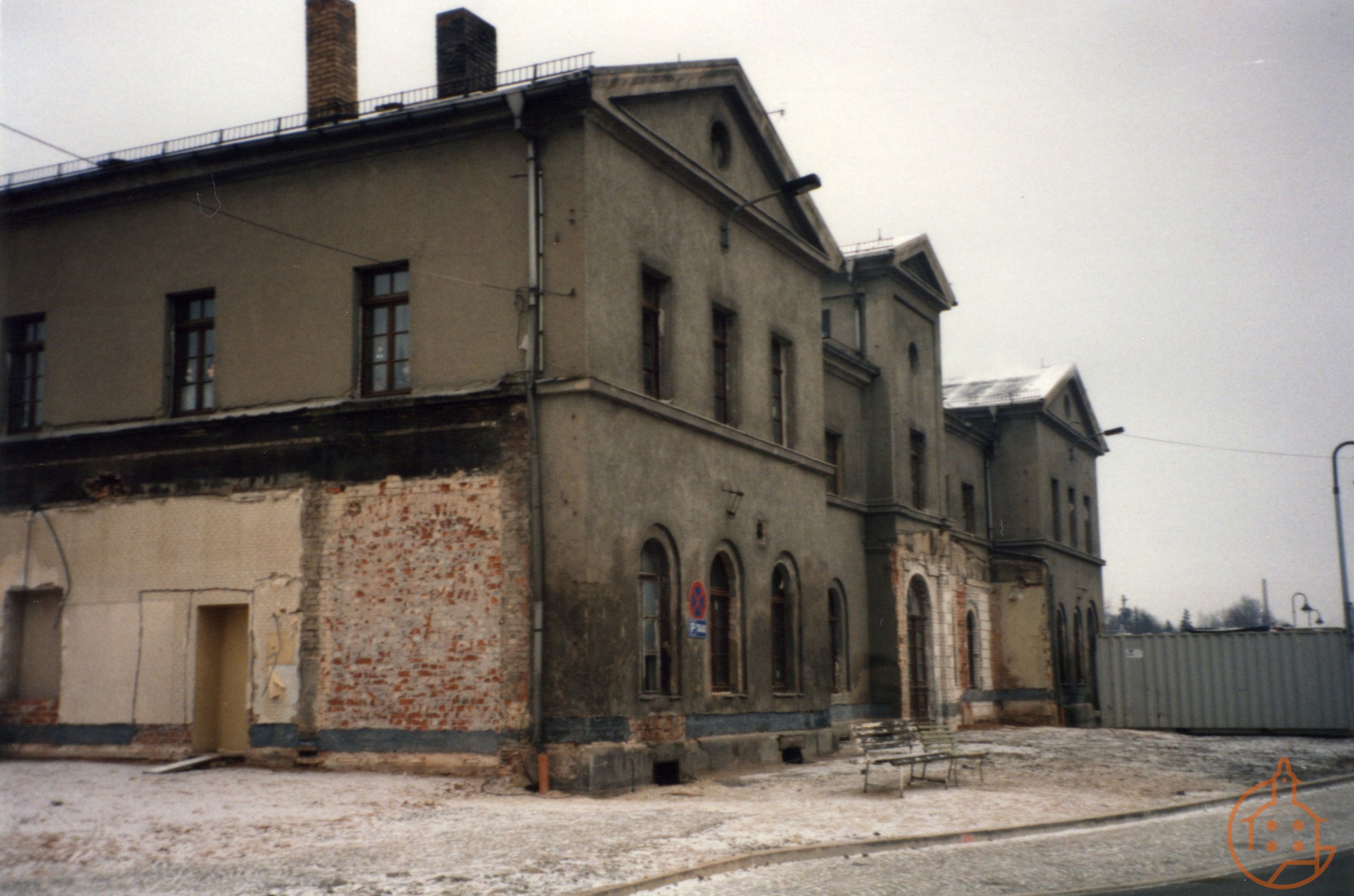 Bahnhofsgebäude von der Vorderseite während der Rekonstruktion