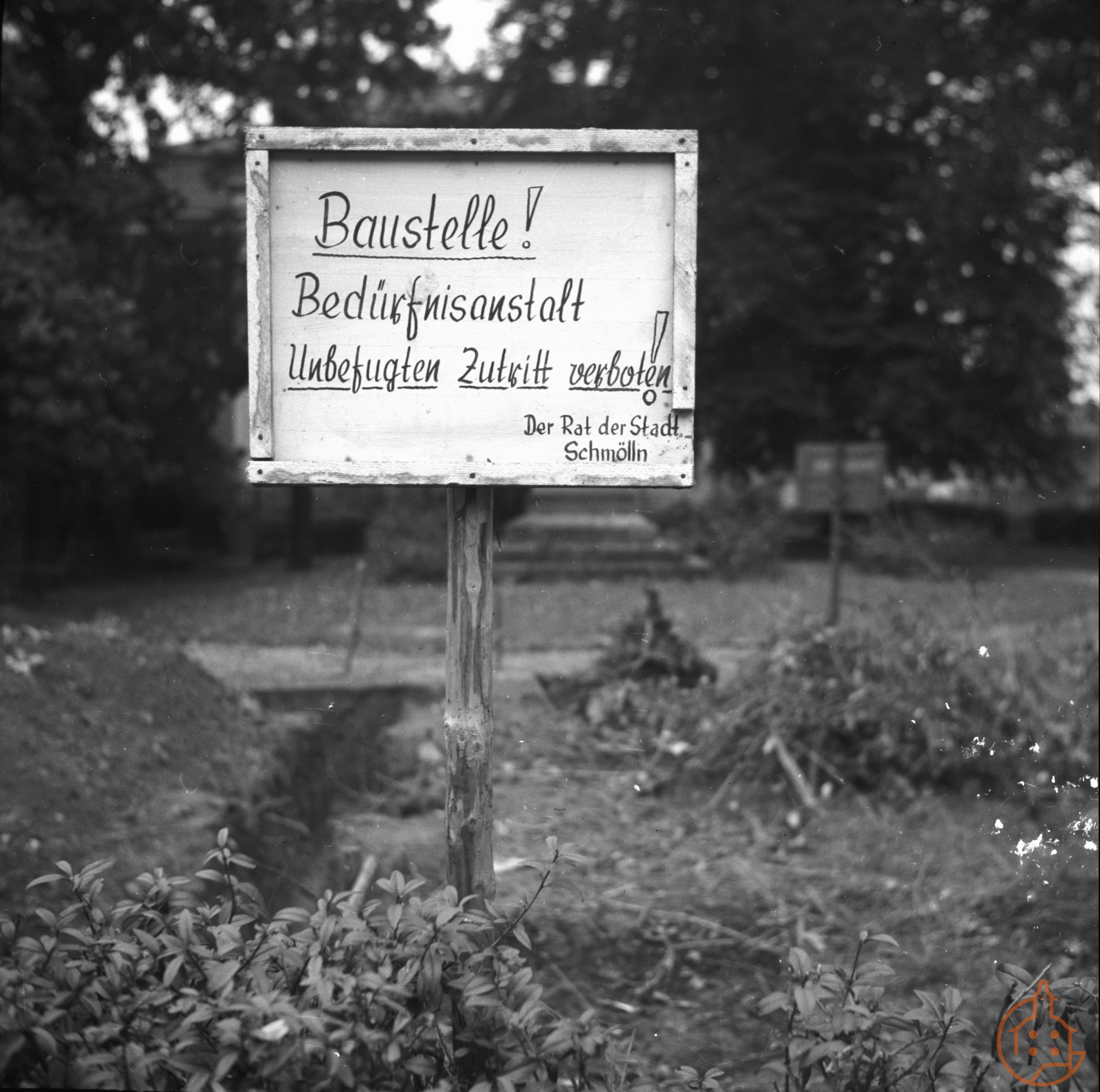 Verbotsschild wegen Bau der Bedürfnisanstalt (öffentliche Toilette) auf dem Schillerplatz