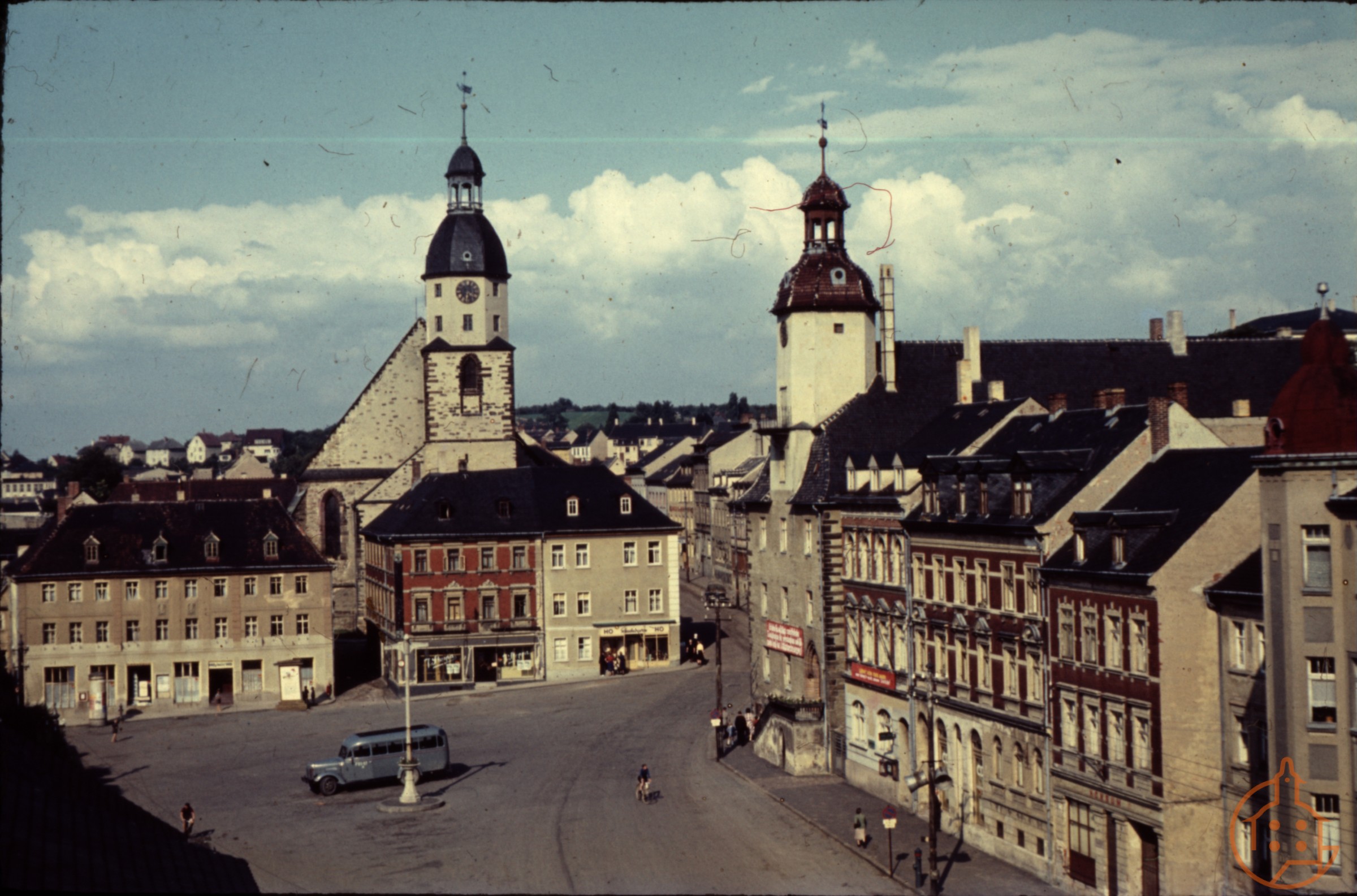 Blick von Haus Markt 26 auf den Markt mit Rathaus und Kirche