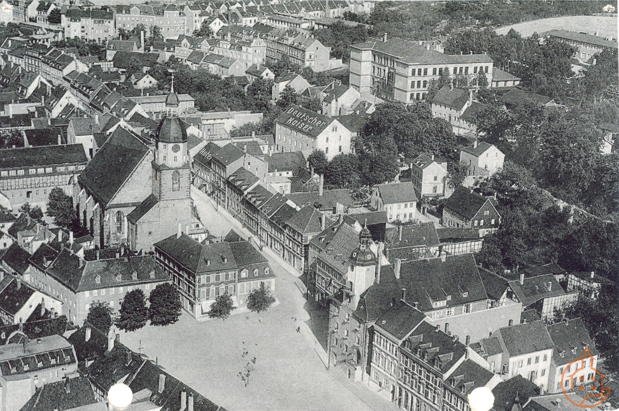 Blick auf die Stadtkirche St. Nicolai, Rathaus, Hotel Deutscher Kaiser und Obere Schule (Regelschule "Am Eichberg") (Luftaufnahme)