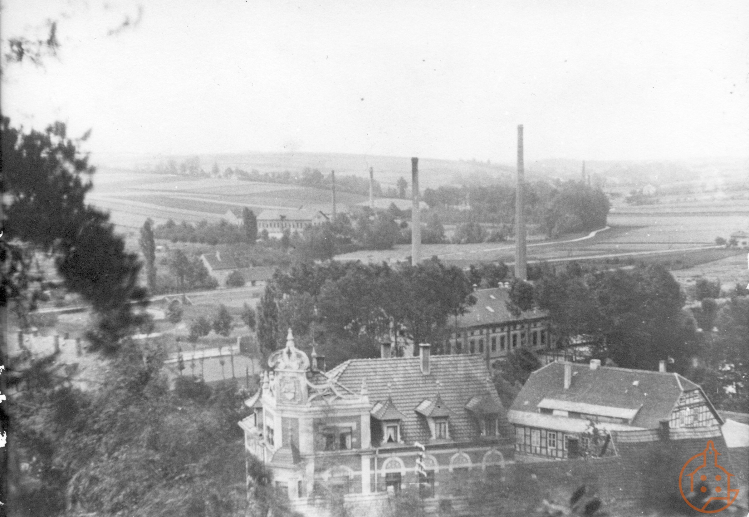 Blick vom Pfefferberg auf das Haus der Gebrüder Fritzsche (Ronneburger Straße 41), deren Zigarrenfabrik (jetzt Knopfmuseum) und die Firma Schaller & Söhne (Jähler) in der Grenzstraße