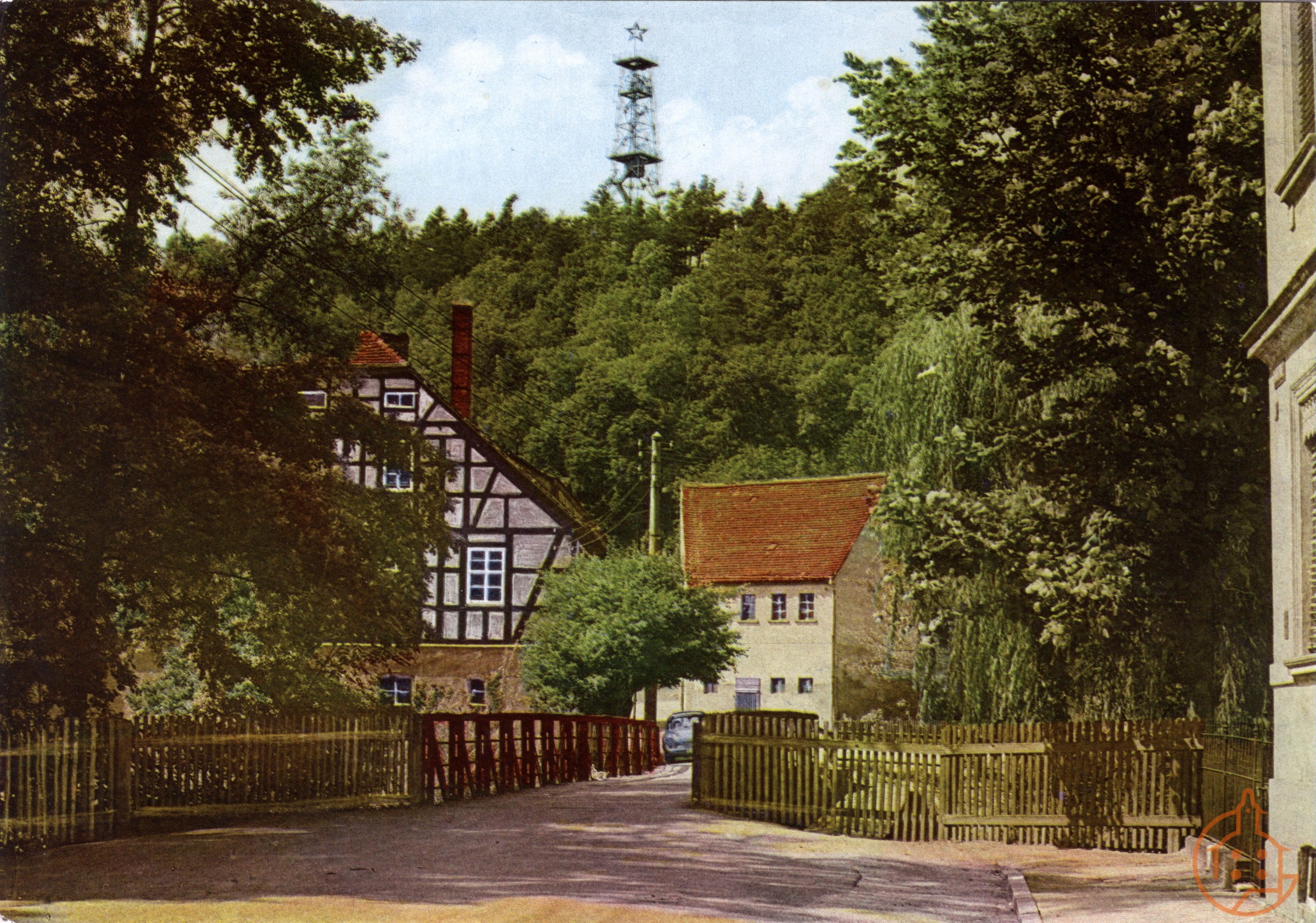 Blick über die Brücke in der Grenzstraße zum Aussichtsurm