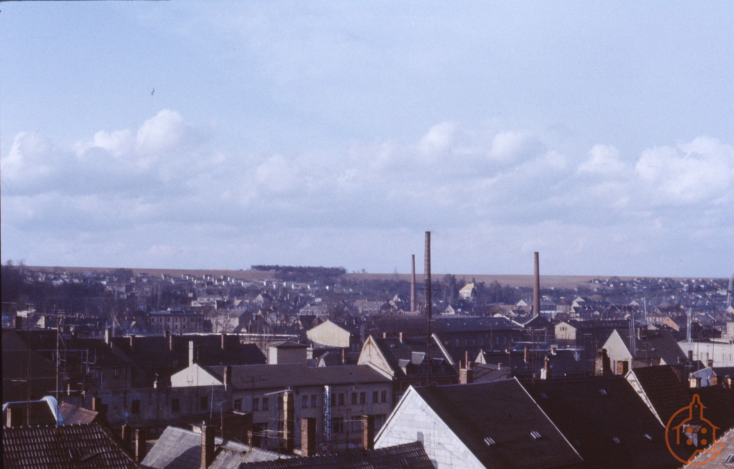 Blick vom Rathausturm über die Stadt in Richtung Stadtwald