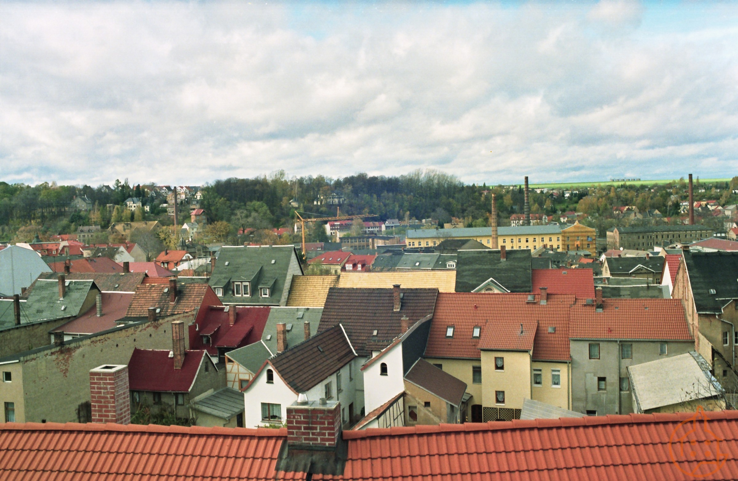 Blick über Schmölln von Süd nach Nord. In Bildmitte das Hotel Bellevue hinter Bäumen. Standort des Fotograf etwa Am Vereinshaus.