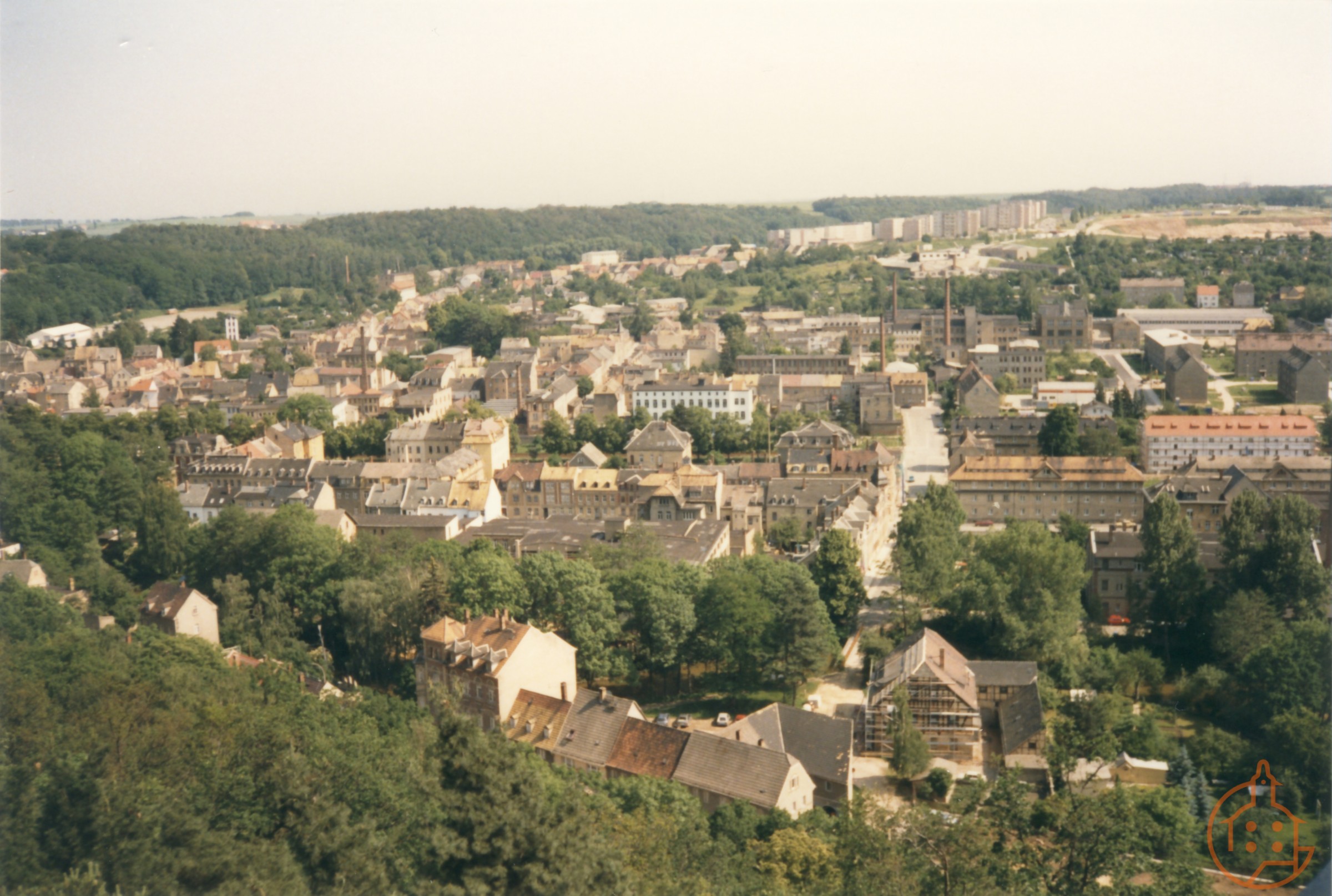Blick vom Aussichtsturm (Ernst-Agnes-Turm) in Richtung Heimstätte. Grenzstraße und Knopfmuseum (mit Gerüst)