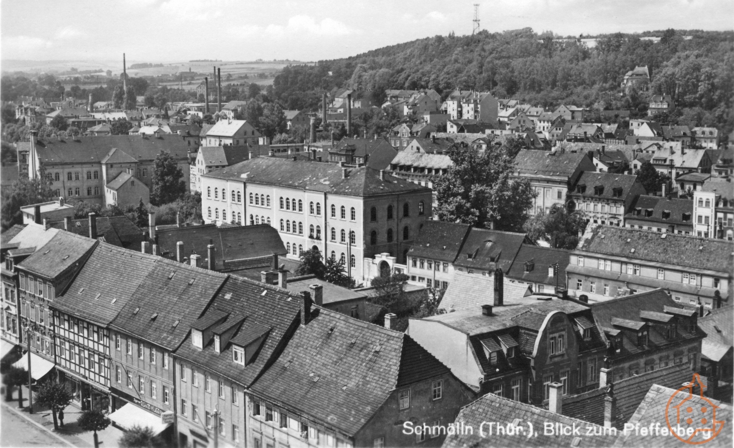 Blick vom Kirchturm in Richtung untere Schule, auf den Pfefferberg und Aussichtsturm (Ernst-Agnes-Turm)