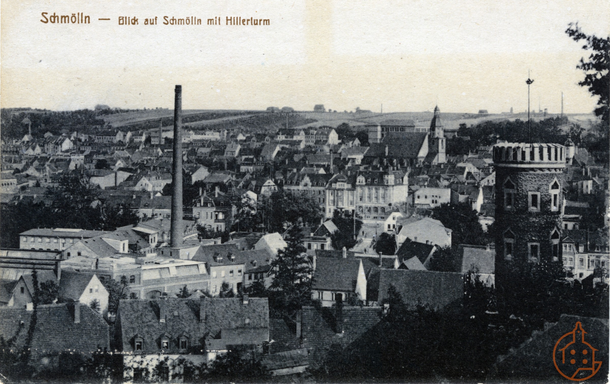 Blick vom Pfefferberg vorbei am Hillerturm auf die Stadt (Postkarte)