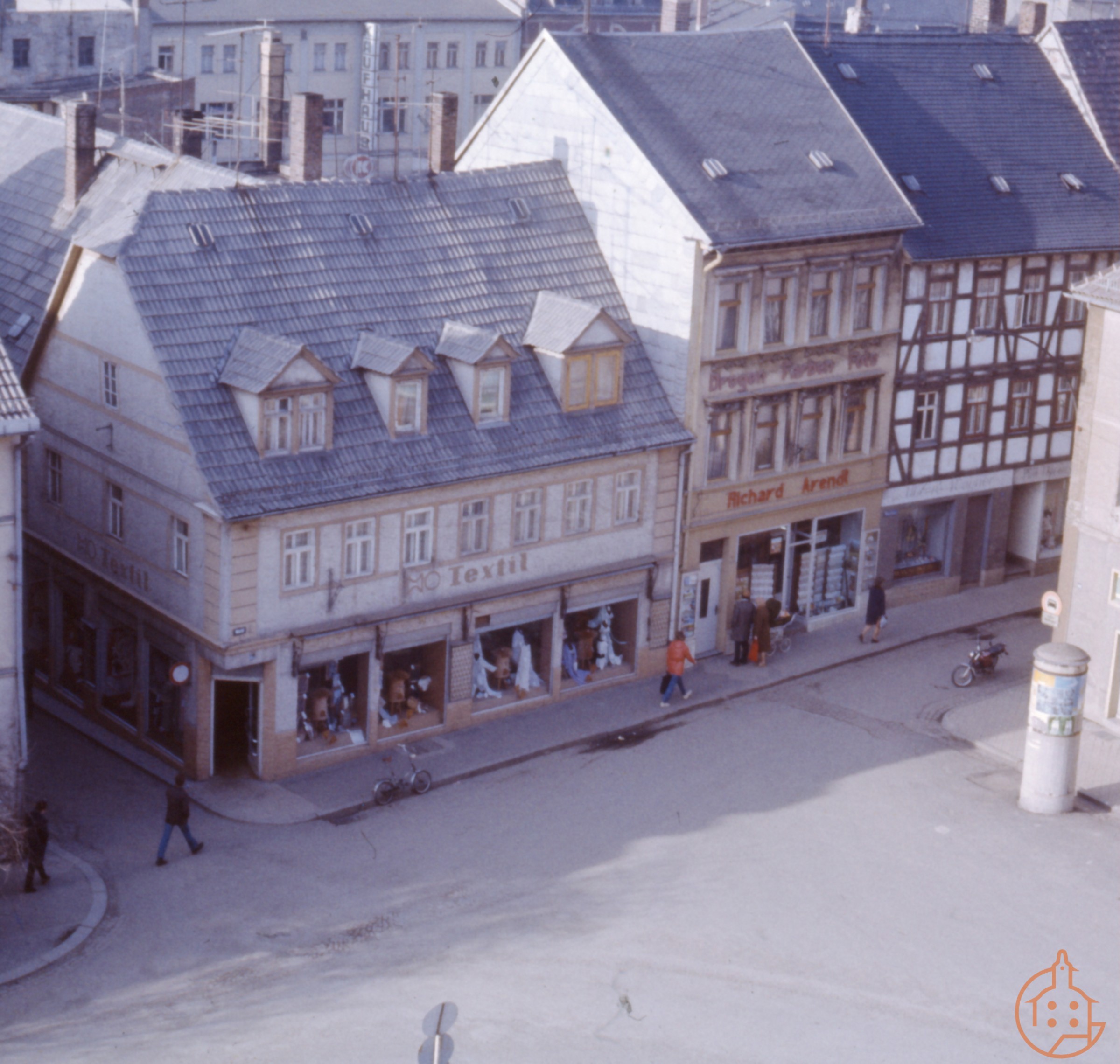 Blick vom Rathaus auf die Häuser Ecke Mittelstraße und Pfarrgasse