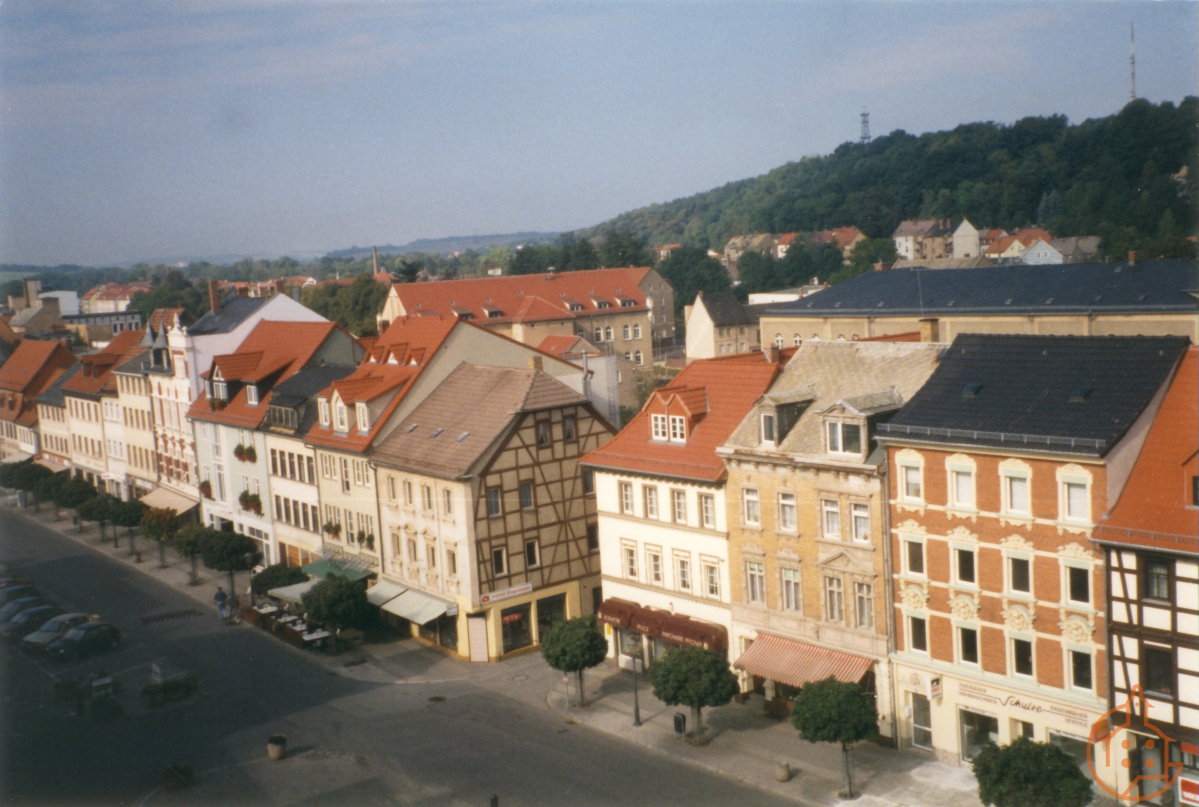 Blick vom Rathausturm auf die untere Marktseite und zum Aussichtsturm (Ernst-Agnes-Turm)