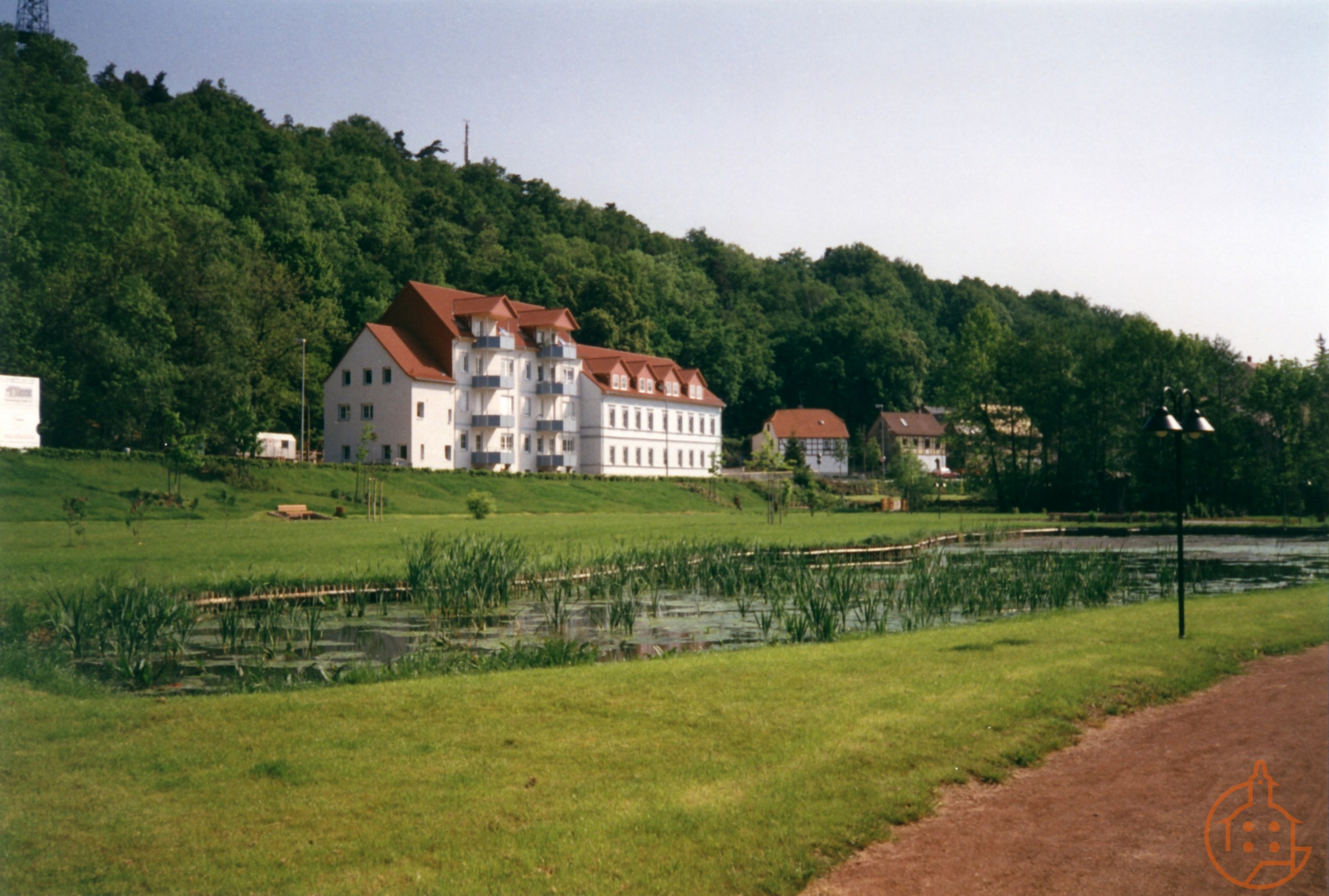 Blick vom Stadtparkt zur Ronneburger Straße, neue Wohnungen in der ehemalige Weihmühle.
