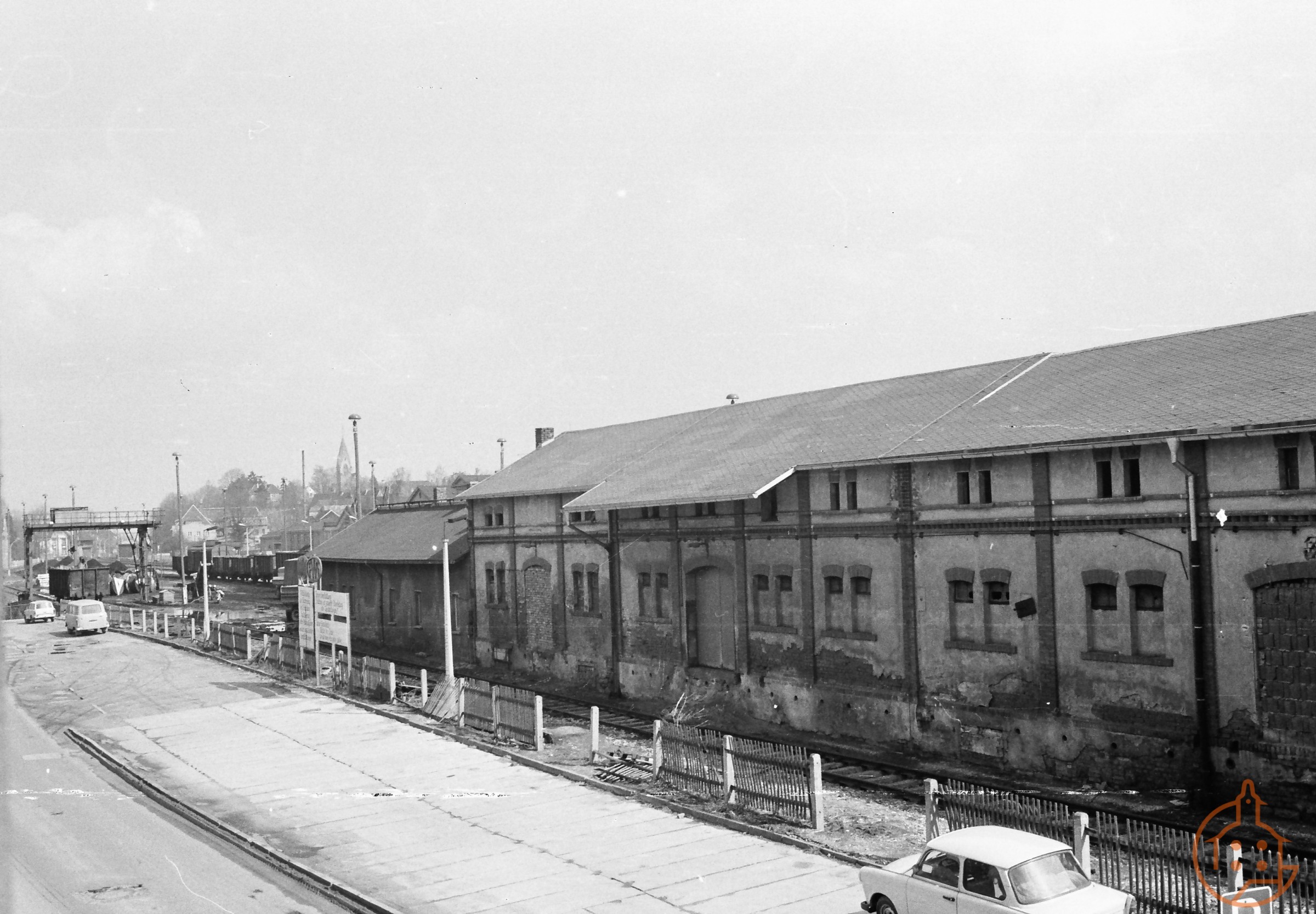 Blick von der Altenburger Straße auf das Bahngelände mit Güterschuppen.