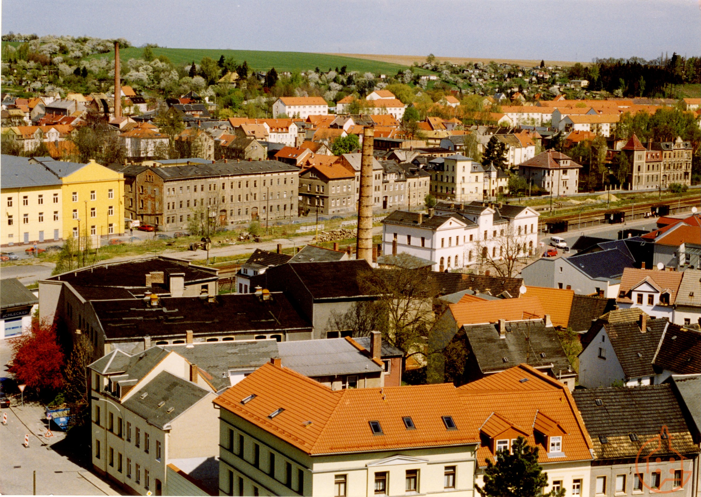 Blick von der Drehleiter auf dem Kirchplatz  in Richtung Altenburger Straße und Neubauviertel