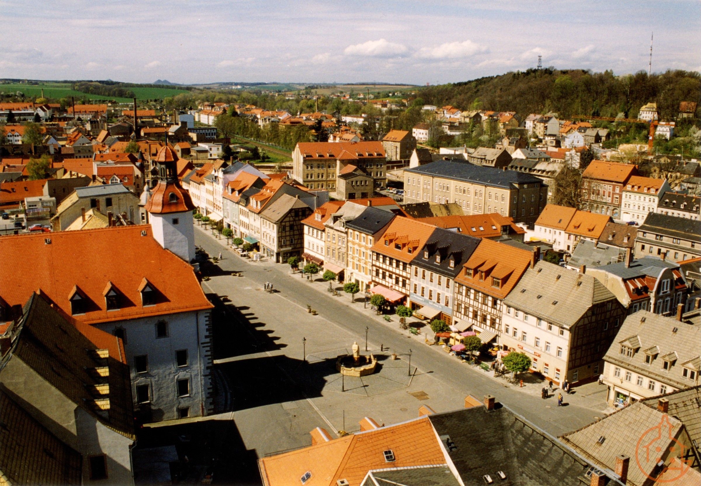 Blick von der Drehleiter in der Gößnitzer Straße zur unteren Marktseite