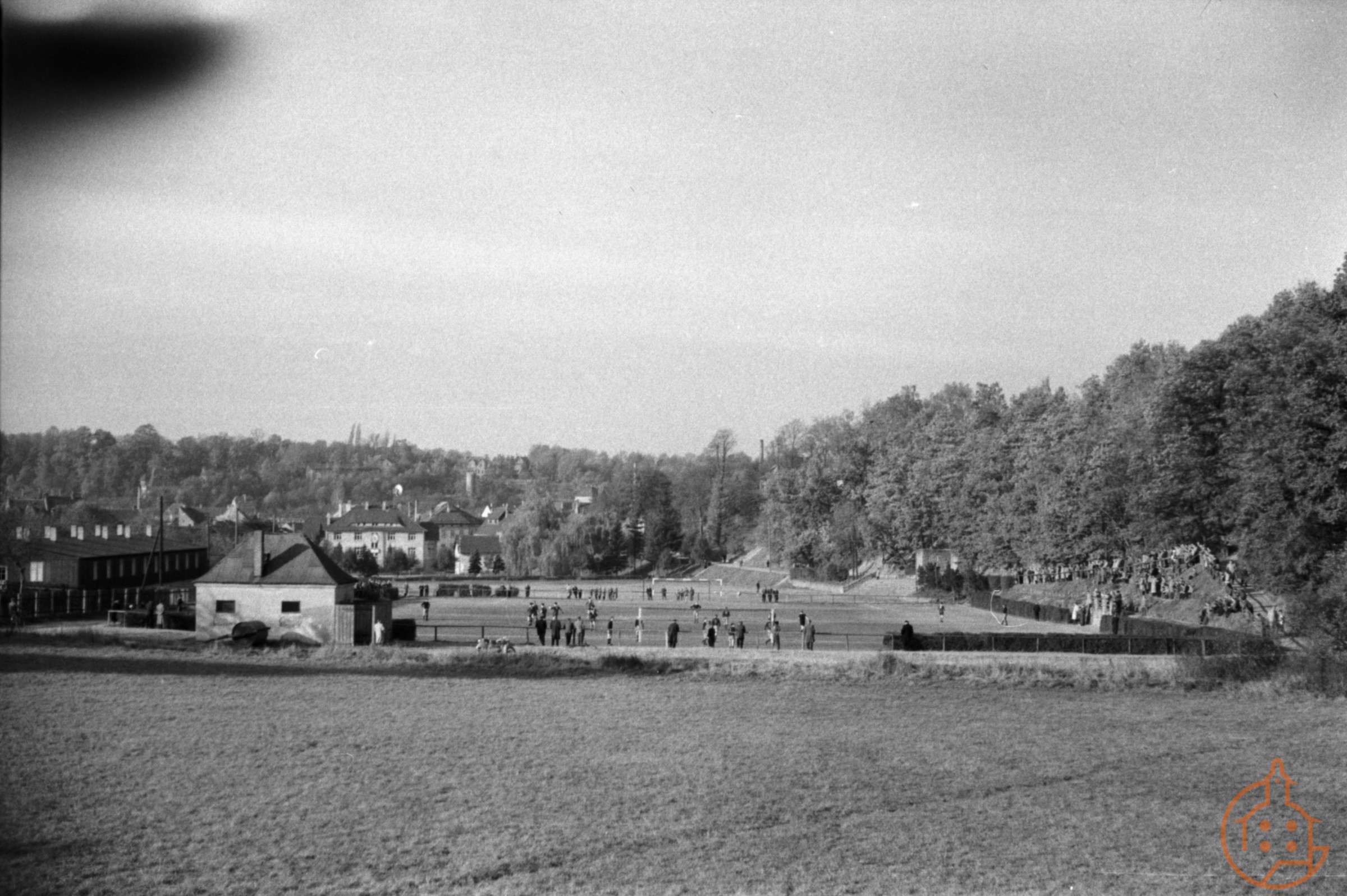 Blick von Jählers Wiese zum Sportplatz beim Fußballspiel.