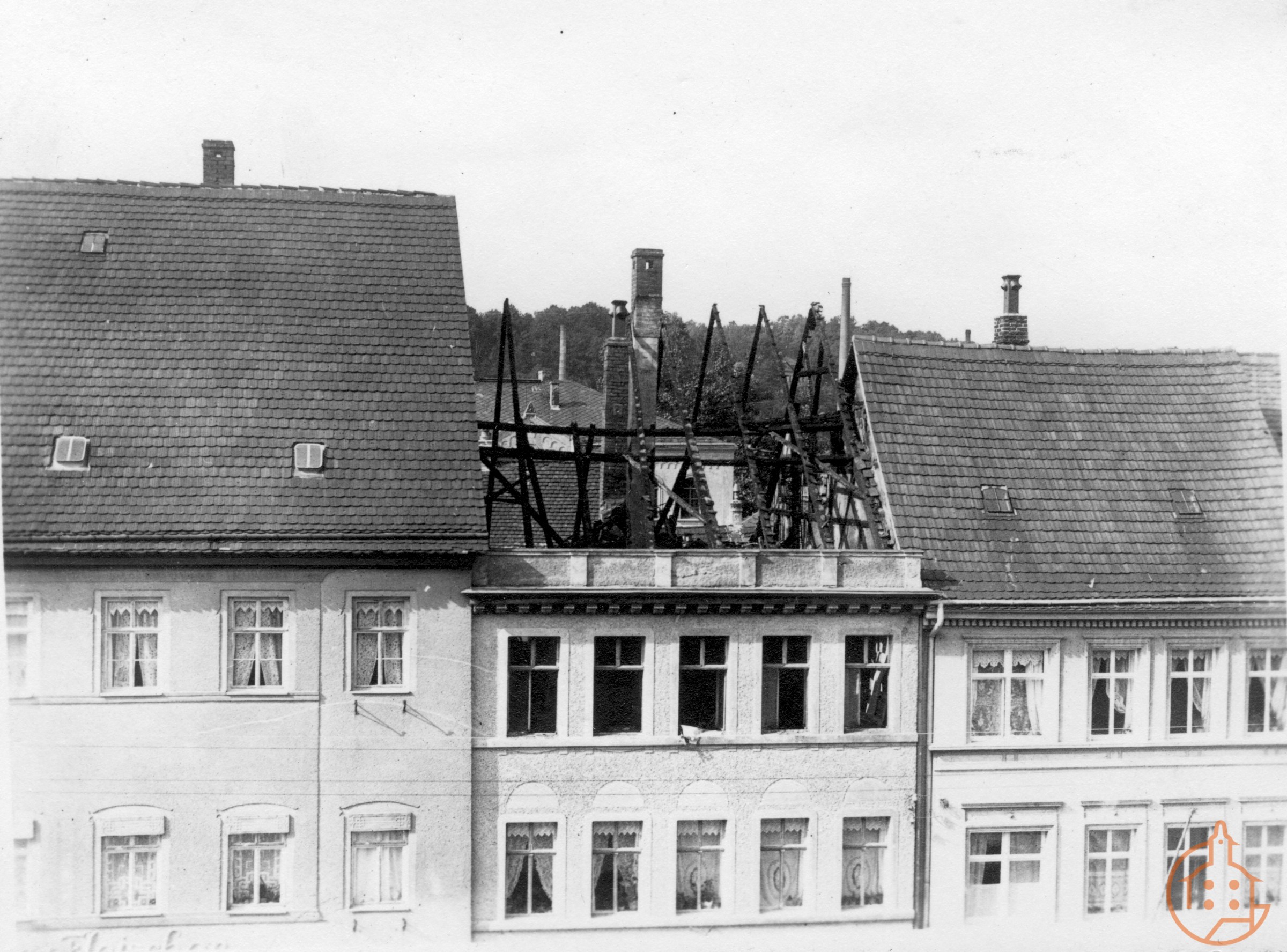 Vorderansicht des zerstörten Dachstuhls des Hauses Brauer am Markt nach Brand