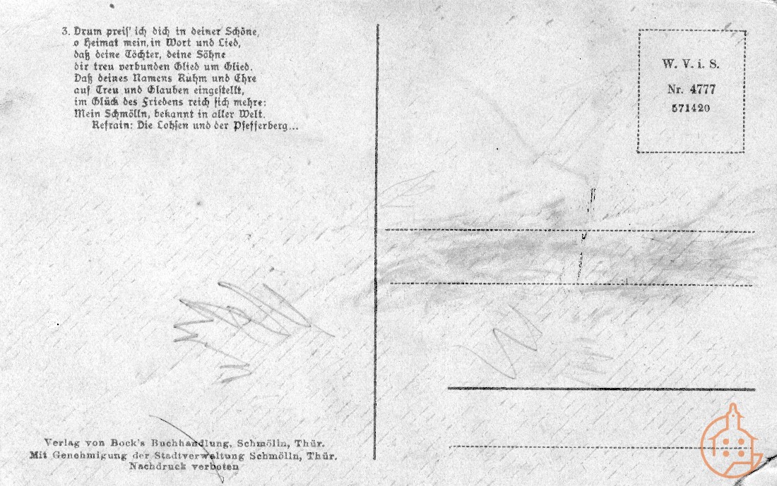 Brauereiteich mit Lied über Schmölln anläßlich der 600-Jahr-Feier. Rückseite der Postkarte mit 3. Strophe.