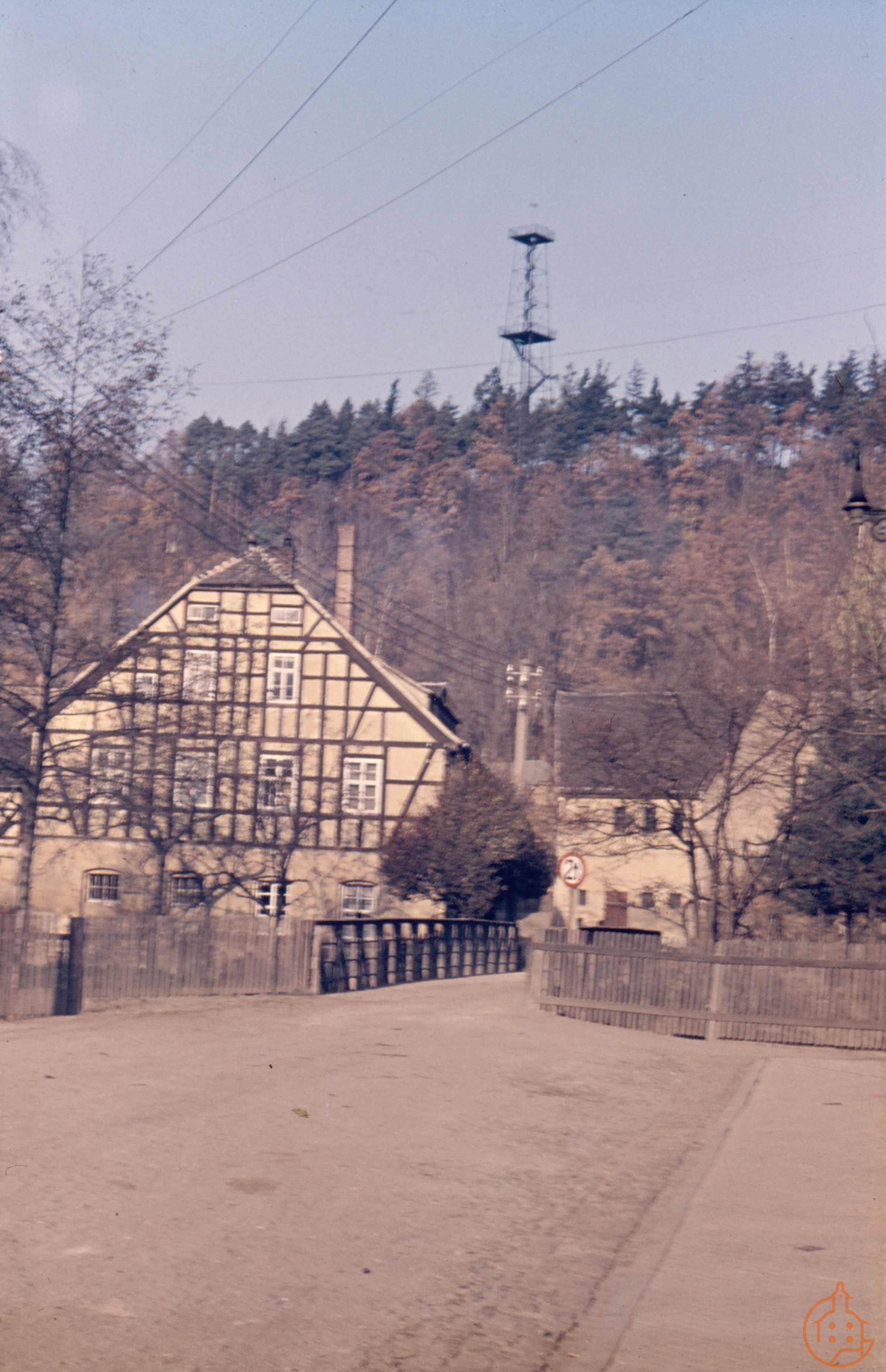 Blick über die Brücke in der Grenzstraße zum Knopfmuseum (ehemals Zigarrenfabrik Fritzsche) und zum Aussichtsturm (Ernst-Agnes-Turm)