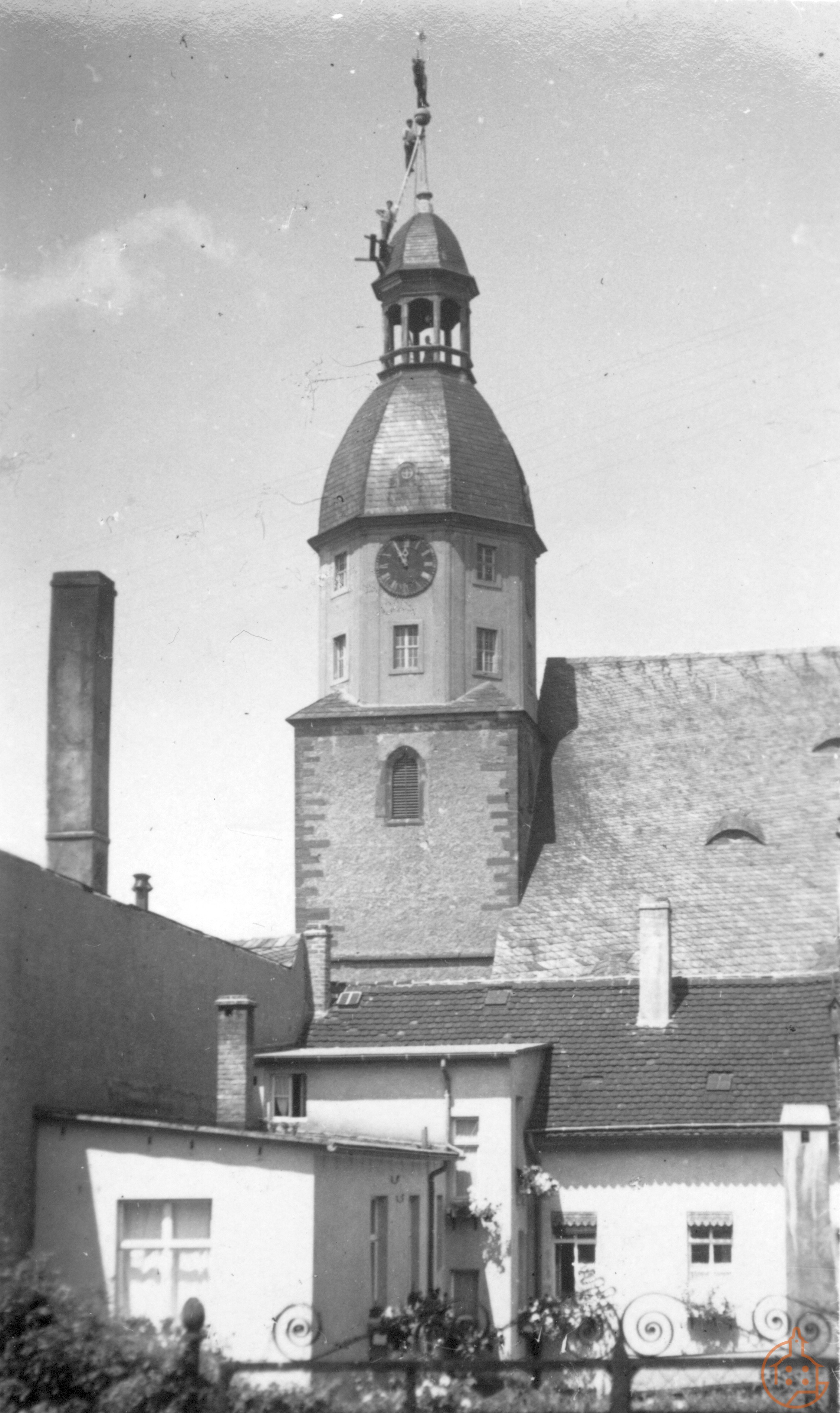 Dachdecker auf der Kirchturmspitze der Schmöllner Stadtkirche St. Nicolai, Gebäude in der Pforte