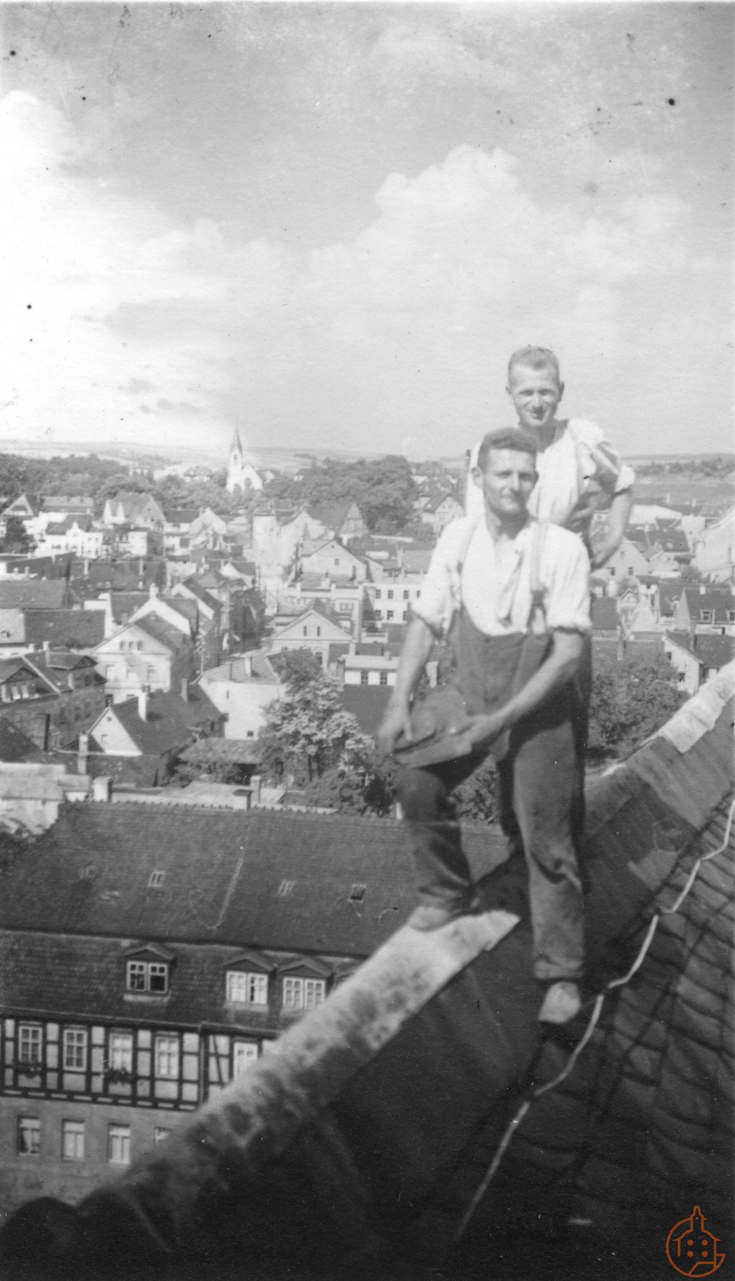Dachdecker Willy Daehne als Handlanger, dahinter Dachdeckermeister Gustav Greiner von der Dachdeckerfirma Herbert Haag, Schmölln, Bahnhofsstraße - heute Altenburger Straße