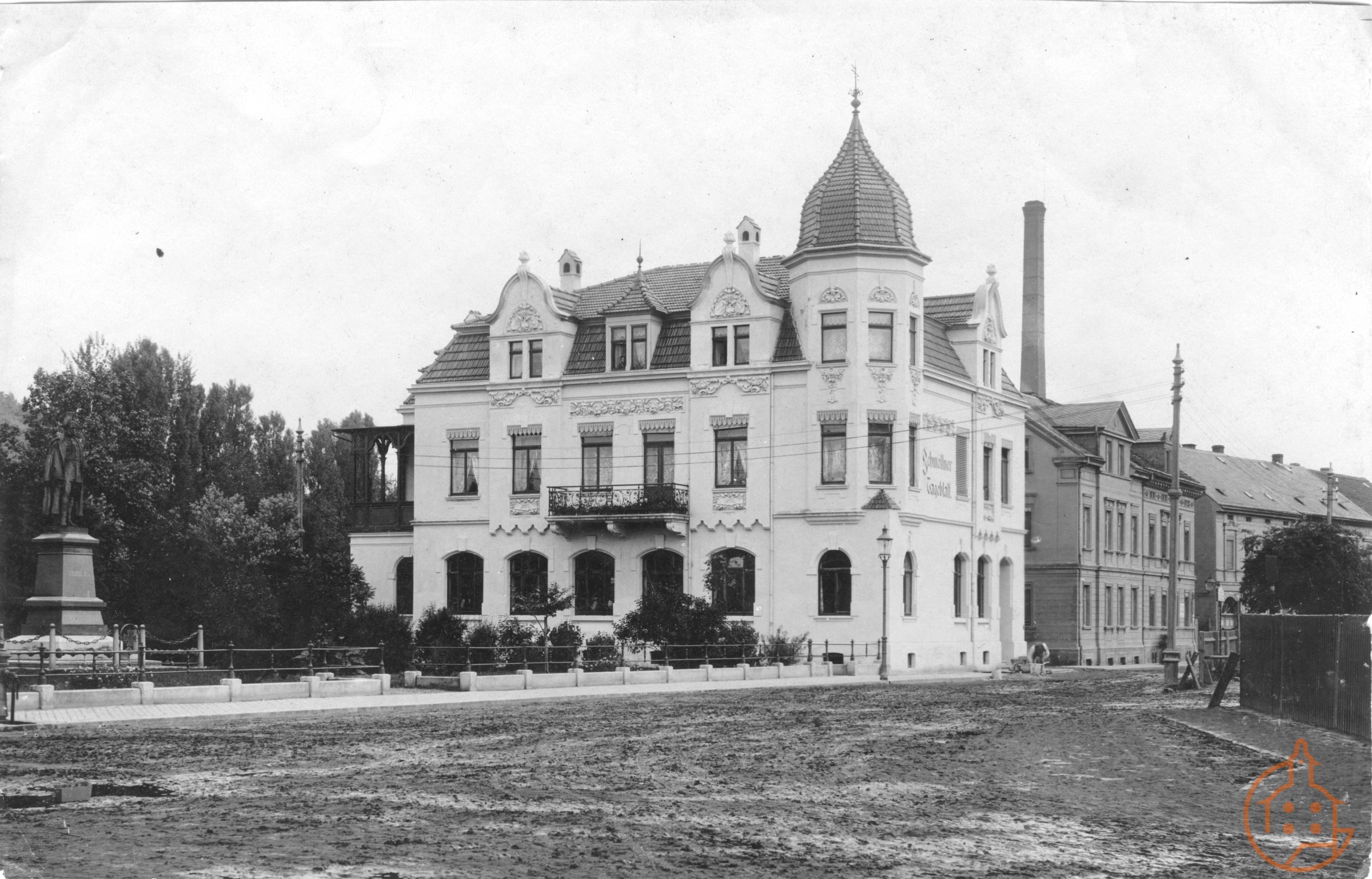 Blick von der Ecke Bahnhofstraße (Altenburger Straße) / Schillerplatz auf das Geschäftshaus der Druckerei Böckel und das Kaiser-Wilhelm- Denkmal