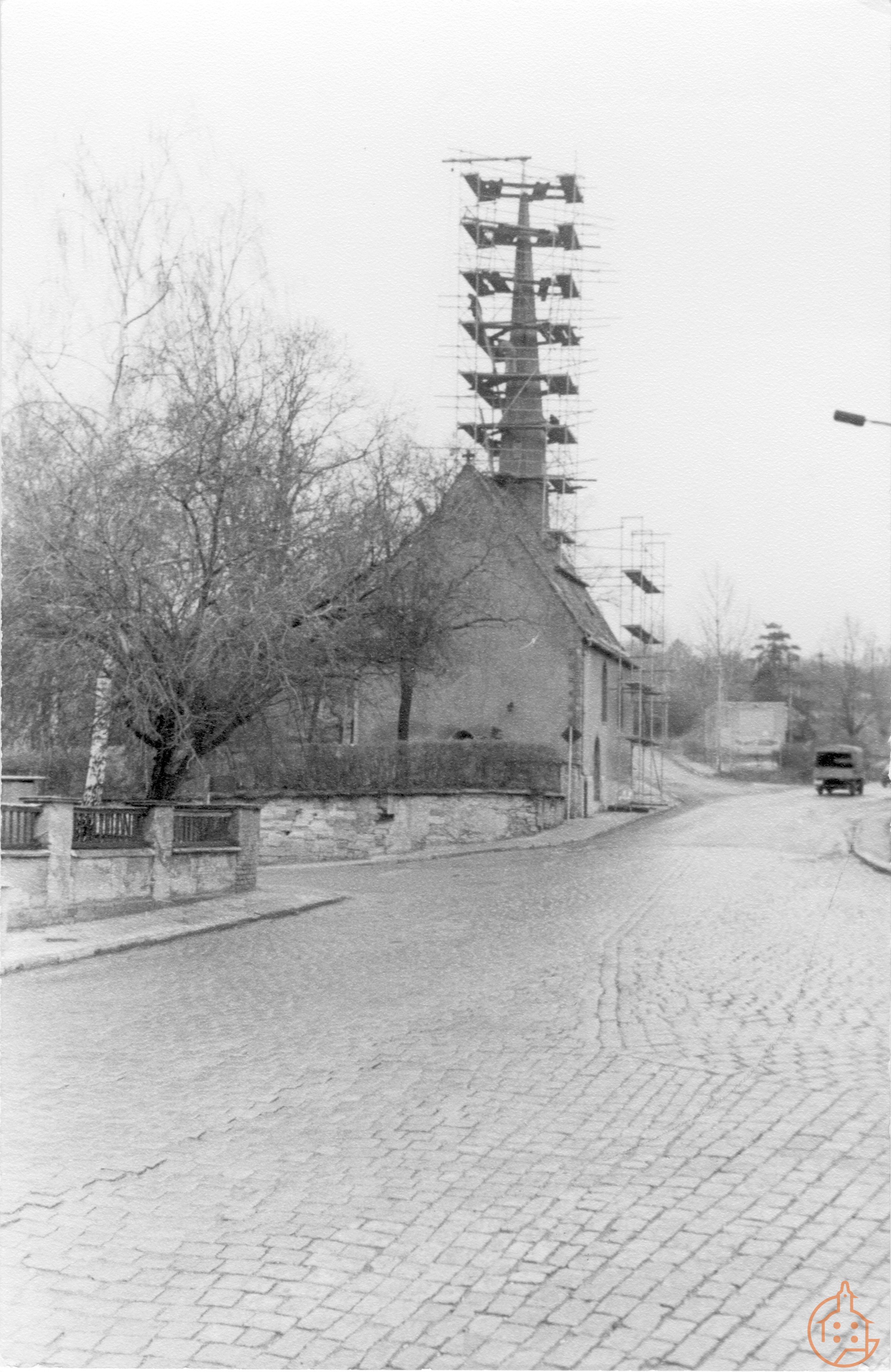 Eingerüsteter Kirchtum der Gottesackerkirche