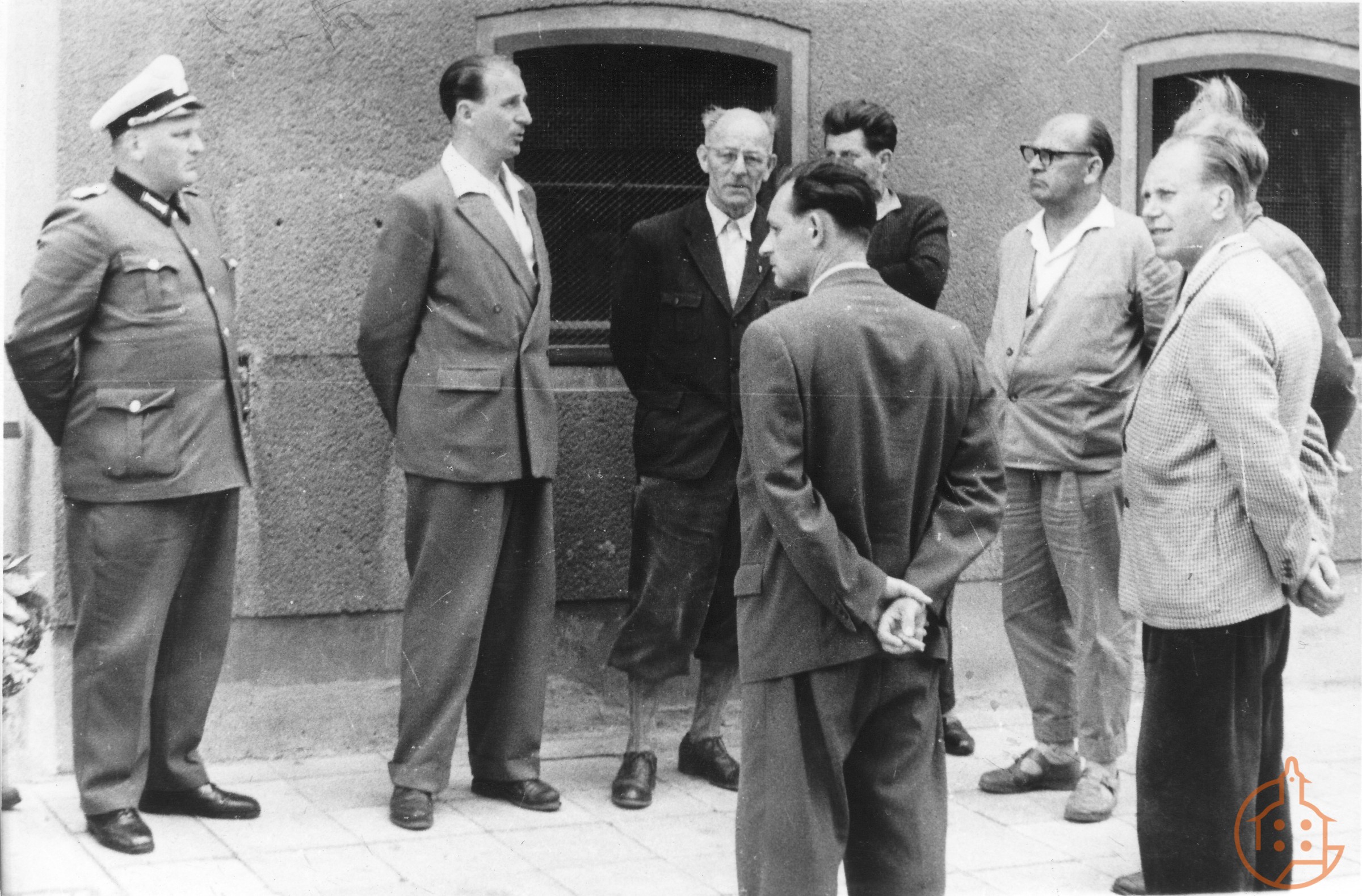 Gruppe von Personen vor der Einweihung der neuen Brücke in der August-Bebel-Straße (ehemals Hermannstraße)