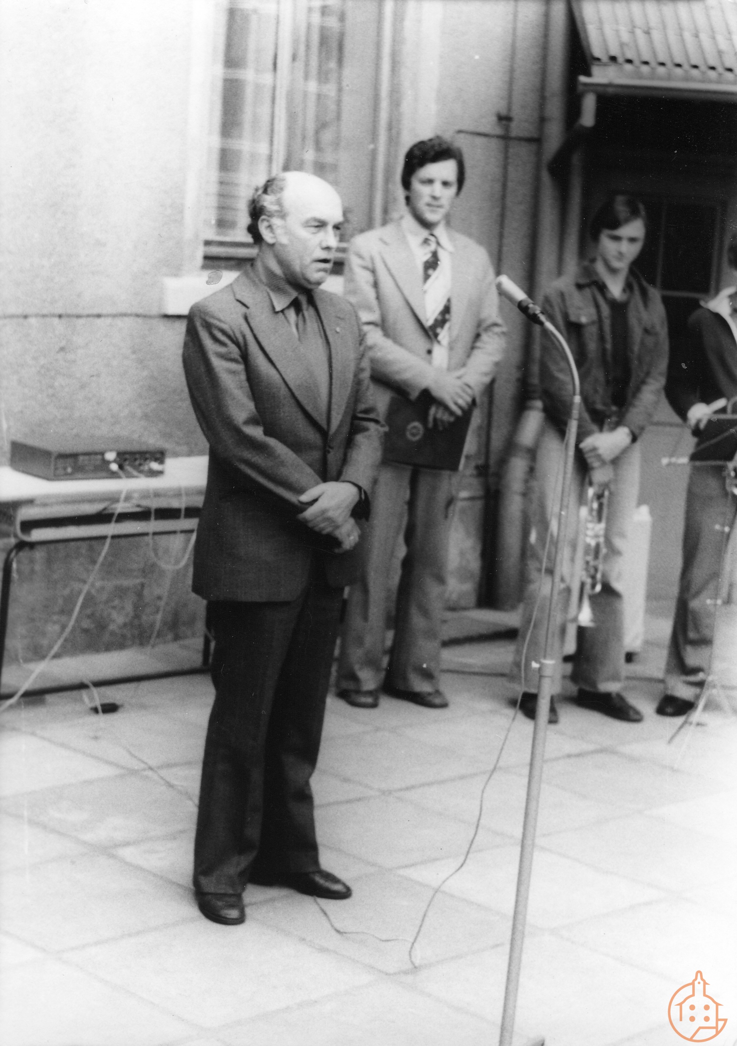 Lehrer Alfred Dworatzek bei einer Rede anläßlich der Einweihung des Gedenksteines für Dr. Theodor Neubauer auf dem Schulhof der EOS