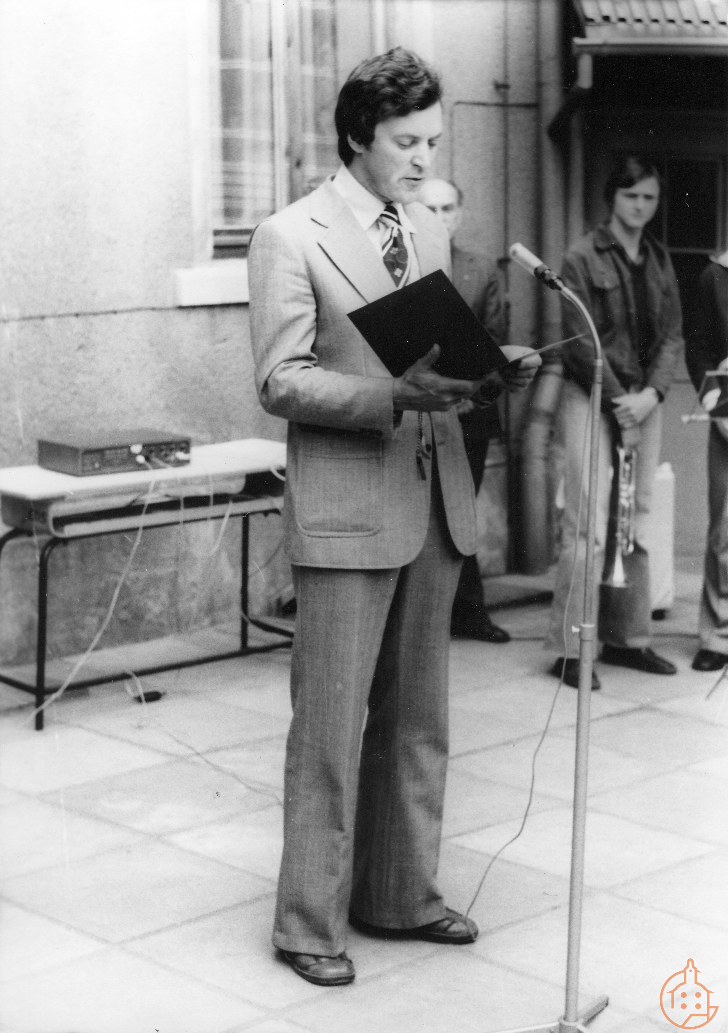 Lehrer Rolf Nitsche bei einer Rede anläßlich der Einweihung des Gedenksteines für Dr. Theodor Neubauer auf dem Schulhof der EOS