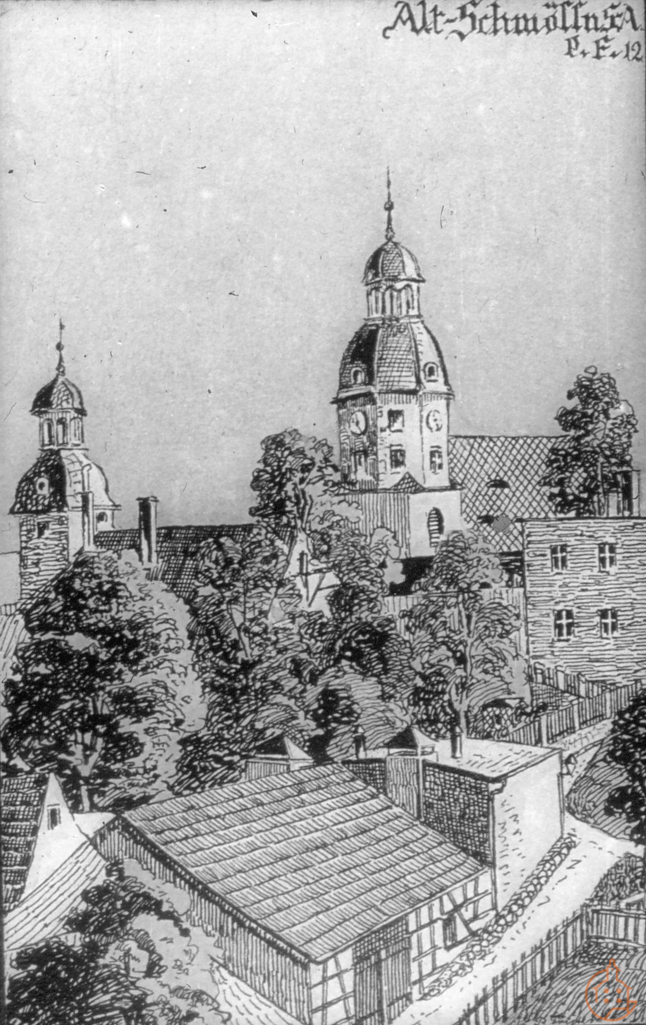 Blick auf Kummersche Werkstatt, Rathaus und Kirche (Schulstraße, Am Brauereiteich)