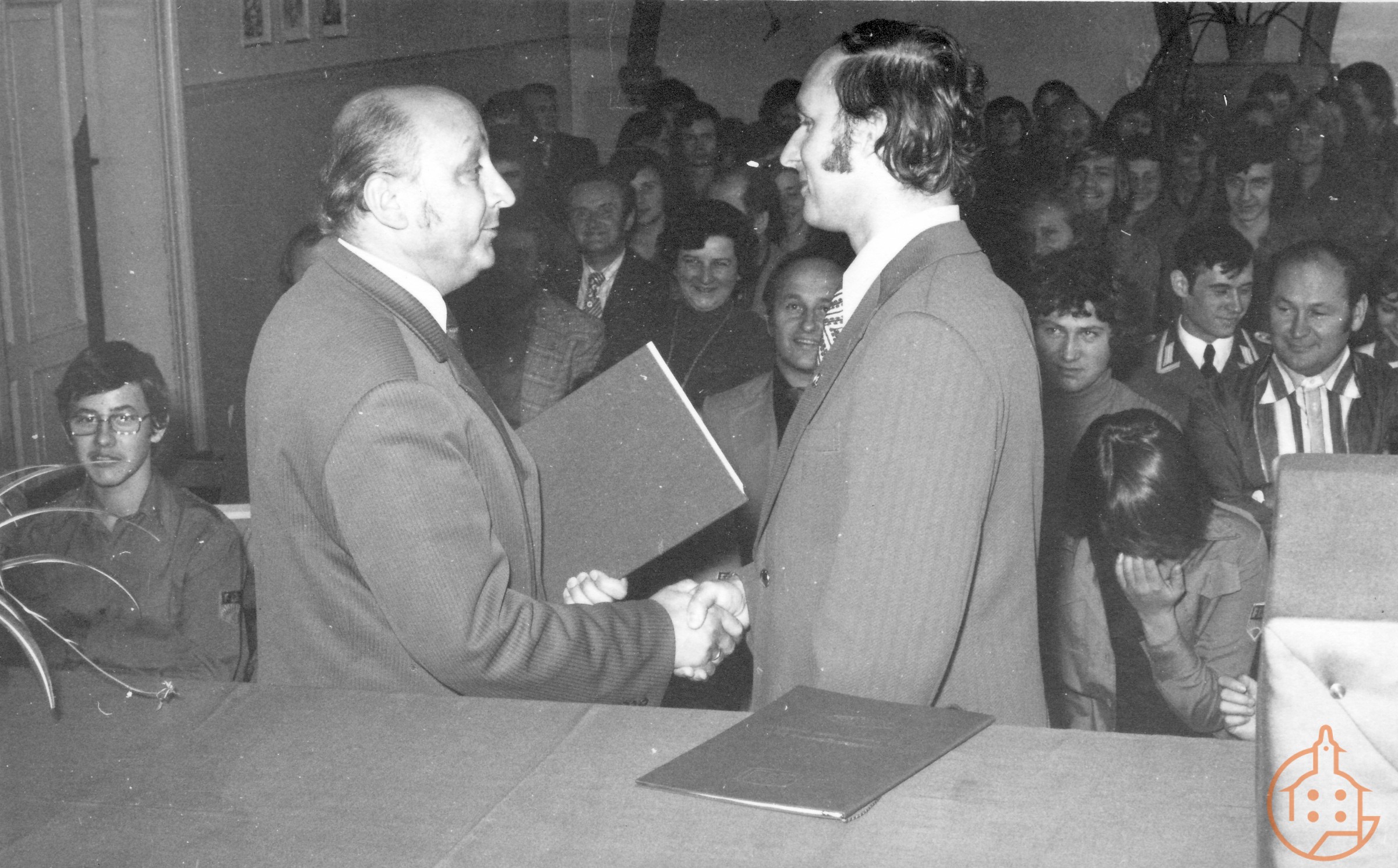 Feierstunde in der Aula der EOS "Dr. Theodor Neubauer" aus Anlaß des Abschlusses des Patenschaftsvertrages zwischen der Schule und dem VEB Rationalisierungsbetrieb