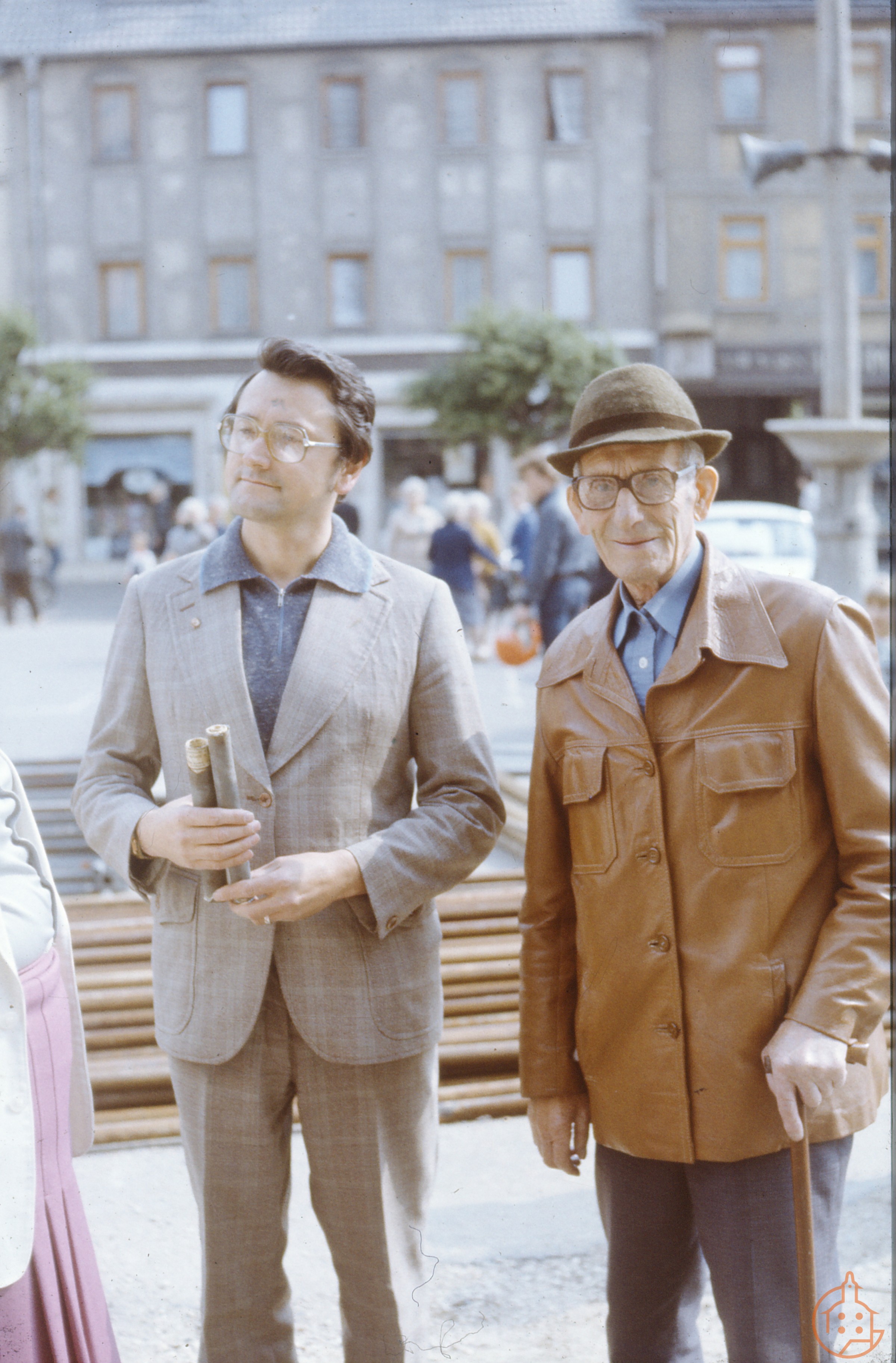 Frank Trummer mit einem älteren Herren vor dem Rathaus anläßlich der Demontage und Öffnung des Turmknopfes