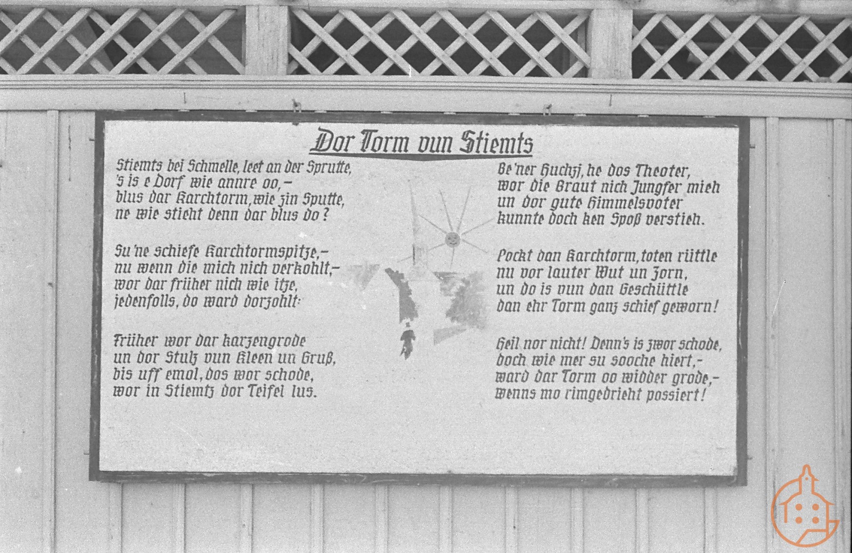Gedicht über "Dor Torm vun Stiemts". Dieses Schild hing viele Jahre am Bahnhof von Großstöbnitz. Die Turmspitze war zu dieser Zeit schief und ist seit 1985 wieder gerade.