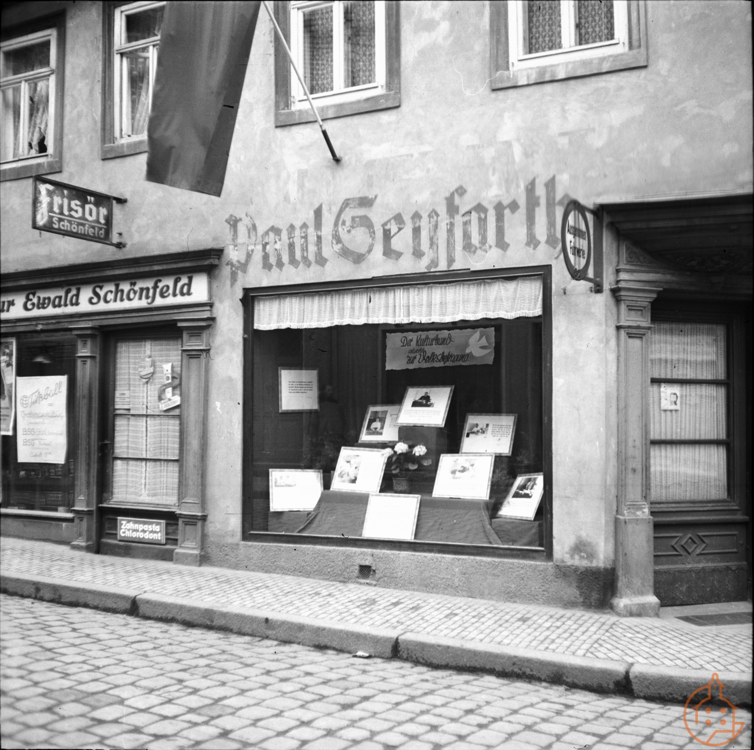 Mittelstraße 5, Geschäft von Paul Seyfarth. Im Schaufenster Antworten des Kulturbundes auf eine Volksbefragung.