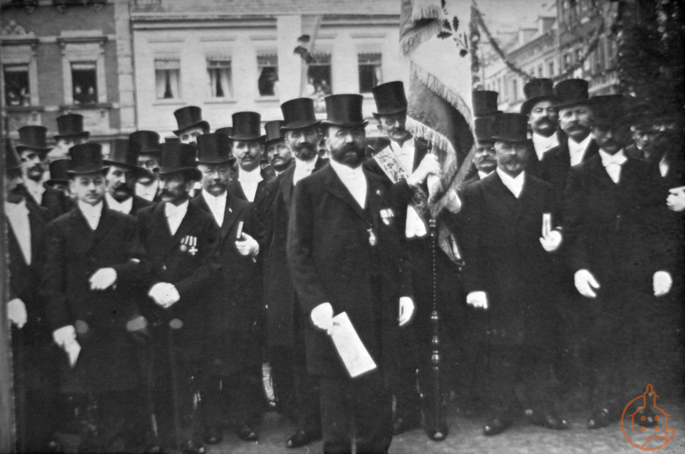 Männergruppe bei unbekannter Veranstaltung vor dem Rathaus