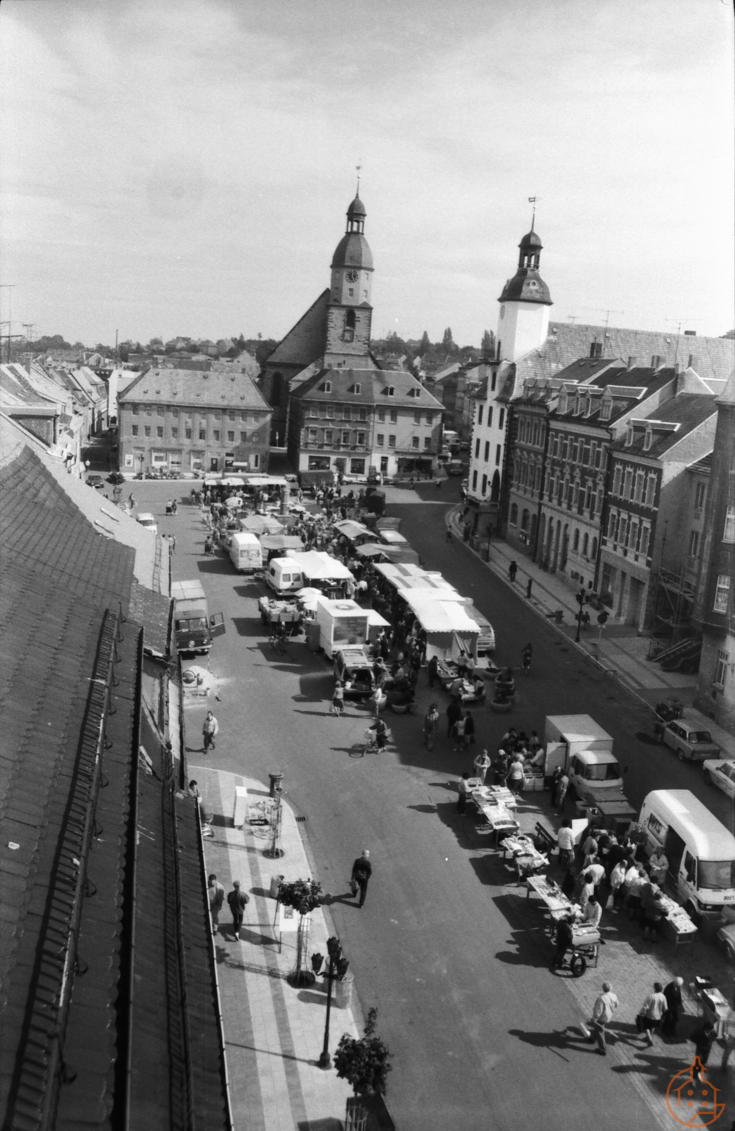 Marktansicht von oben, Händler und Fahrzeuge, Rathaus und Kirche
