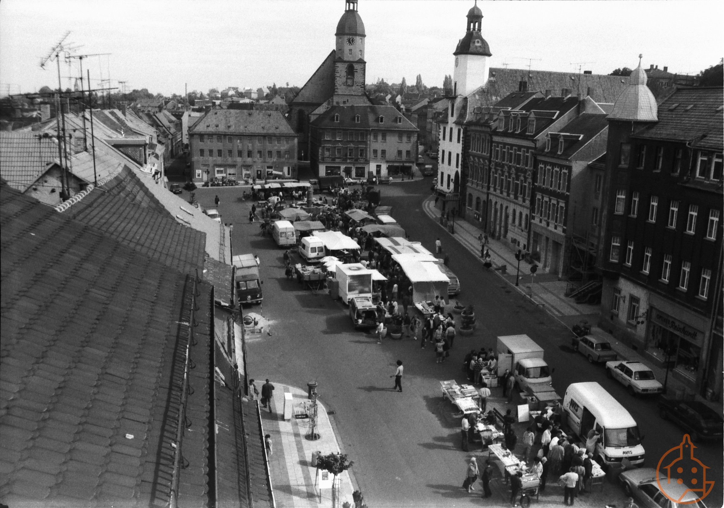 Marktansicht von oben, Händler und Fahrzeuge, Rathaus und Kirche