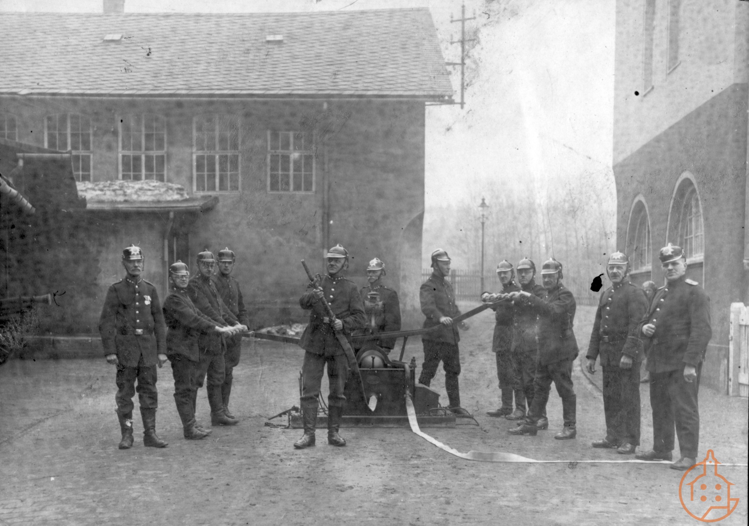Kameraden an der Handdruckspritze des Brauereispritzenzuges mit einer Minutenleistung von 230 Liter.