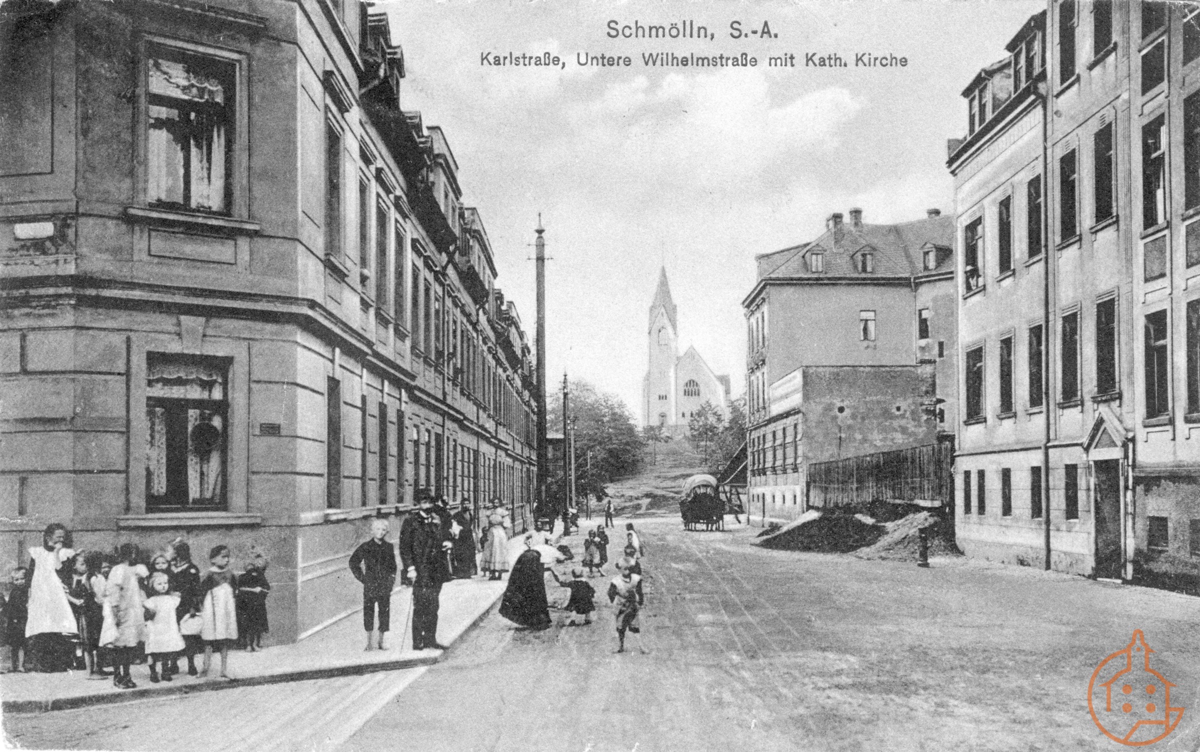 Postkarte der Karlstraße, untere Wilhelmstraße (Karl-Liebknecht-Straße) mit Blick in Richtung Katholischer Kirche