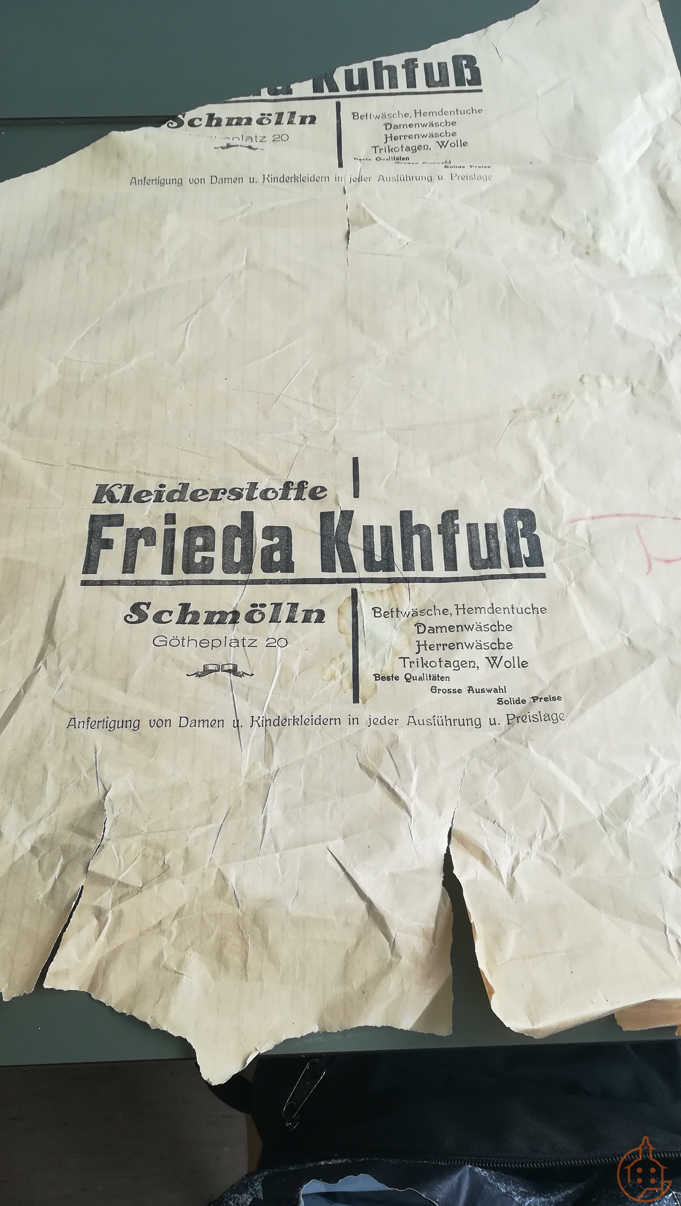 Packpapier des Geschäftes Kleiderstoffe Kuhfuß, eine Rolle davon befindet sich in unserem Museum