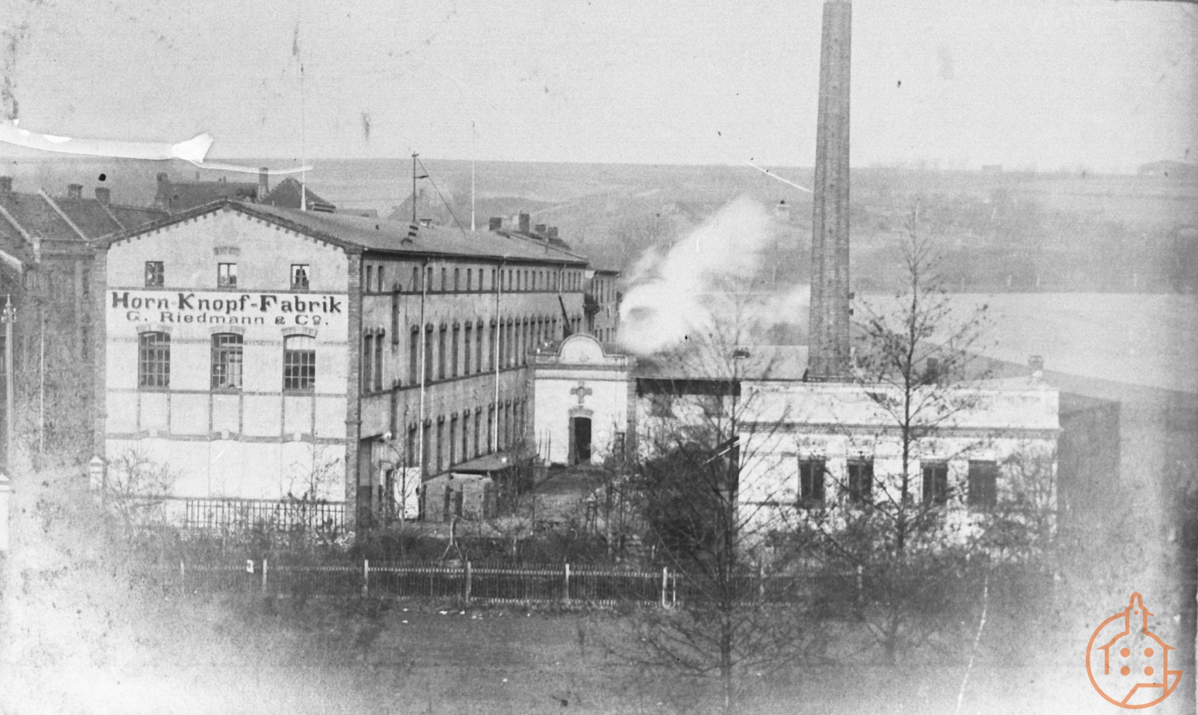 Blick aus Richtung Sprotte auf die Knopffabrik von G. Riedmann